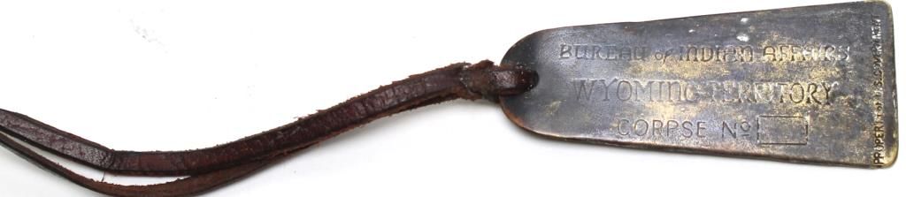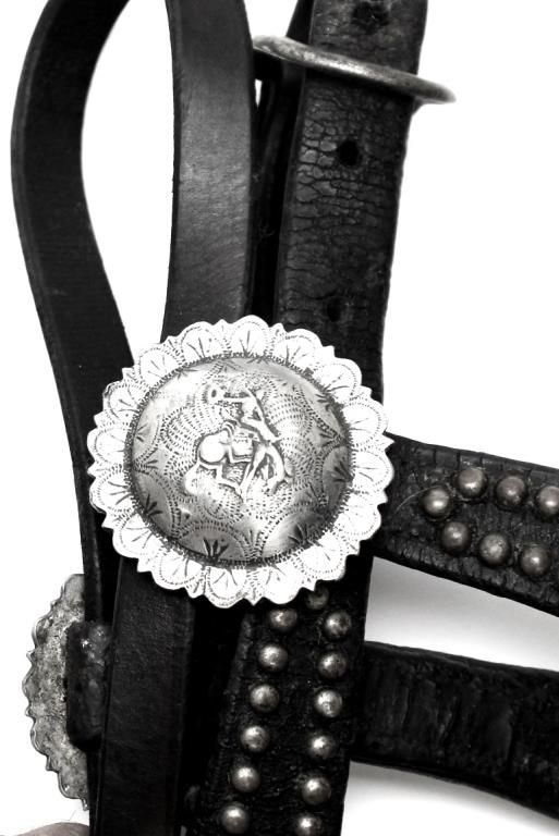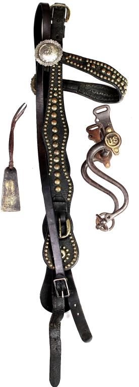 Collection of 3 includes US military bit, spotted wide cheek headstall with later added bucking horse rosettes and brass reproduction Wyoming Territory toe tag.