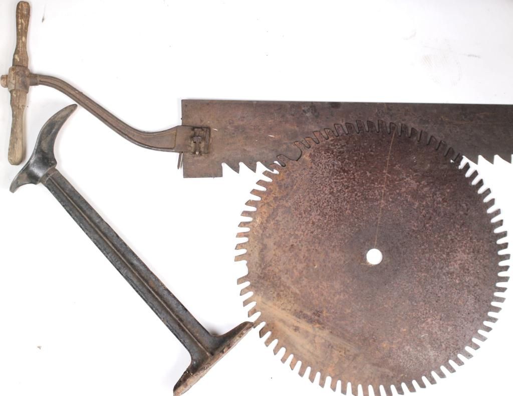 Collection of 3 includes antique ice saw, a shoe repair stand and buzz saw blade. From the Peterson Ranch. Est. 25-50