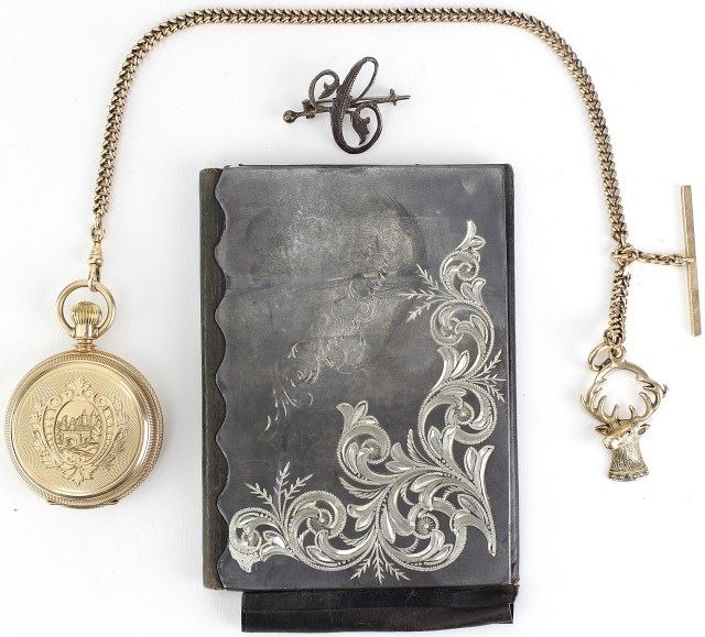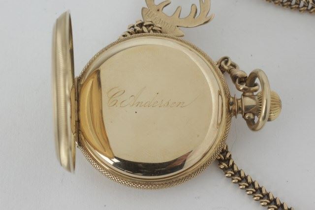 Hunter case pocket watch by American Waltham Co. Royal Model, inscribed C. Anderson on inner dust cover, none running lever set all showing very fine condition including case, crystal and porcelain face. Serial Number on movement 1155003 indication mfg date 1878, inside dust cover stamped W 14K US Assay. Includes watch chain and Elks fob, reverse engraved "H.Frawley a Token of Esteem F. Sonnenschein", stamped 14K the chain unmarked. Watch approx. 36mm across face, heavy gold fob 7/8" X 1 1/2", and Mrs. Christine Frawleys engraved calling card case with her calling cards, front engraved Mrs. Henry Frawley, includes pin back broach with large "C" stamped 800 on reverse. Est. 750-1500