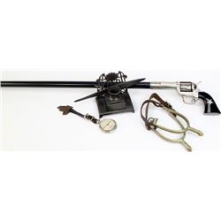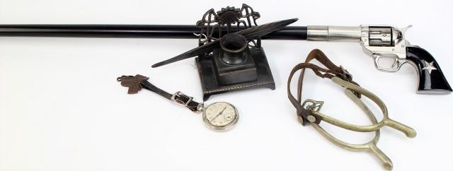military spurs non working pocket with reproduciton R.T. Frazier box, and revolver walking stick.