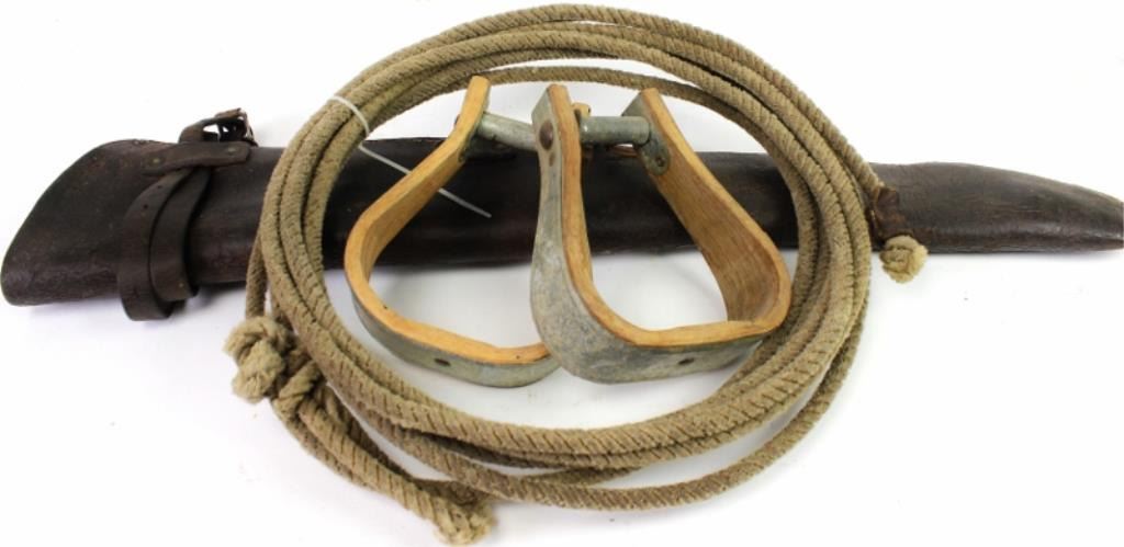 Collection of 3 includes early leather rifle scabbard unmarked, new old stock bentwood stirrups and well used lariat. Perfect for western decor.scabbard unmarked, new old stock bentwood stirrups and well used lariat. Perfect for western decor.