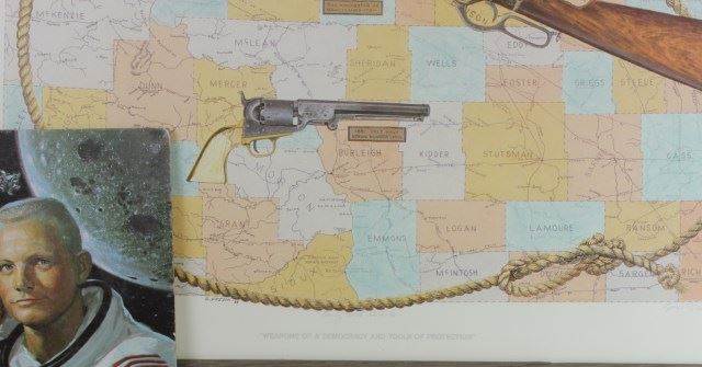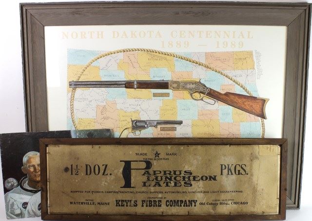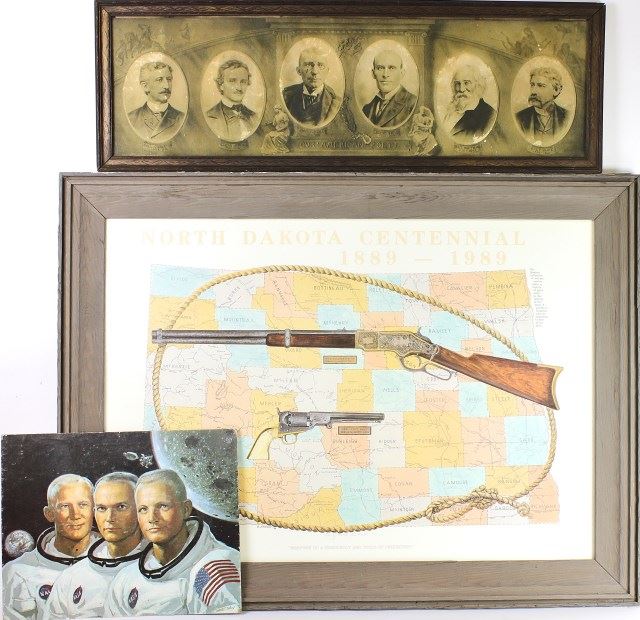centennial, 1889-1989 with Winchester and Colt tools of protection, 26" X 35", an early framed "Our American Poets", 10" X 30" and cardboard litho of Apollo 11 crew, Neal Armstrong, Michael Collins and Buzz Aldrin, 11" X 14". Est. 100-200