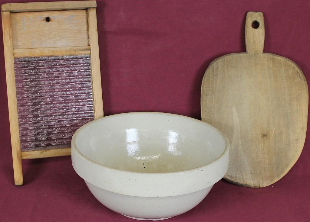 Collection of 3 includes great antique Stoneware, bowl unmarked 13" diameter in very good condition no outside chips, cracks or repairs, a wooden paddle and a traveling size glass and wood wash board. Est. 25-75
