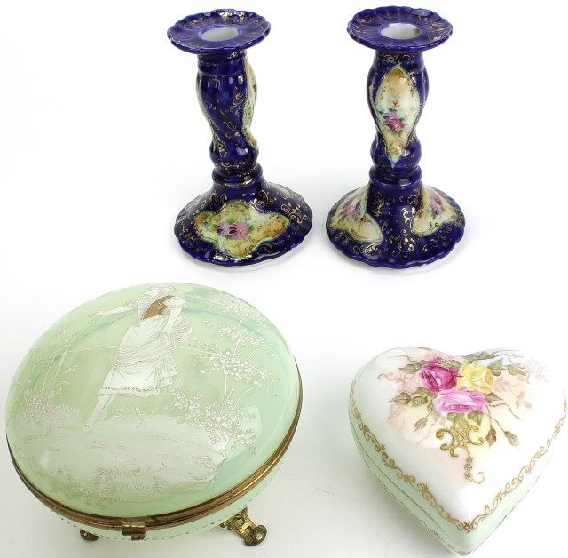 , hinging lid dresser box and hear shaped dresser box. Frawley Estate items. Est. 50-100