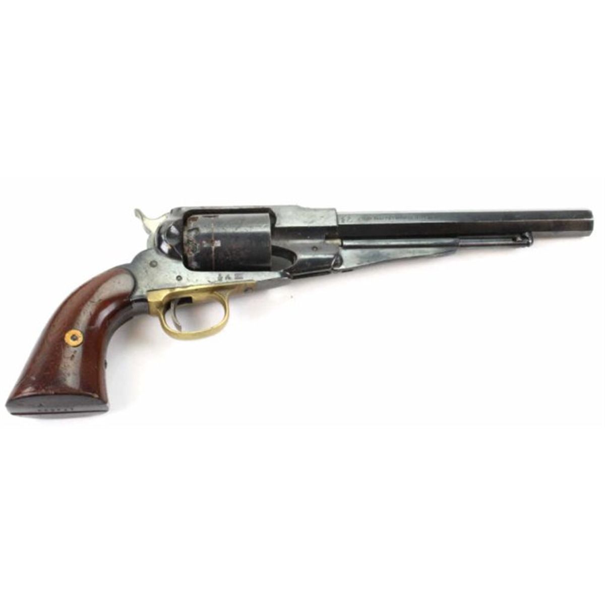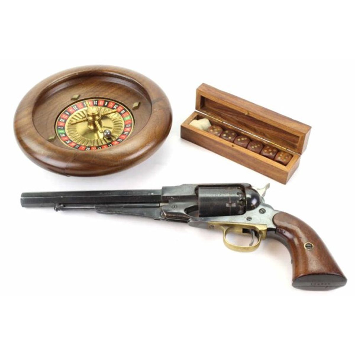Collection of 3 includes miniature wood roulette wheel, contemporary Will and Finck cased dice and reproduction Remington .44 cal. black powder revolver by Pietta with front of grip strap engraved Hill City Shootout HC So. Dakota. NO FFL required.