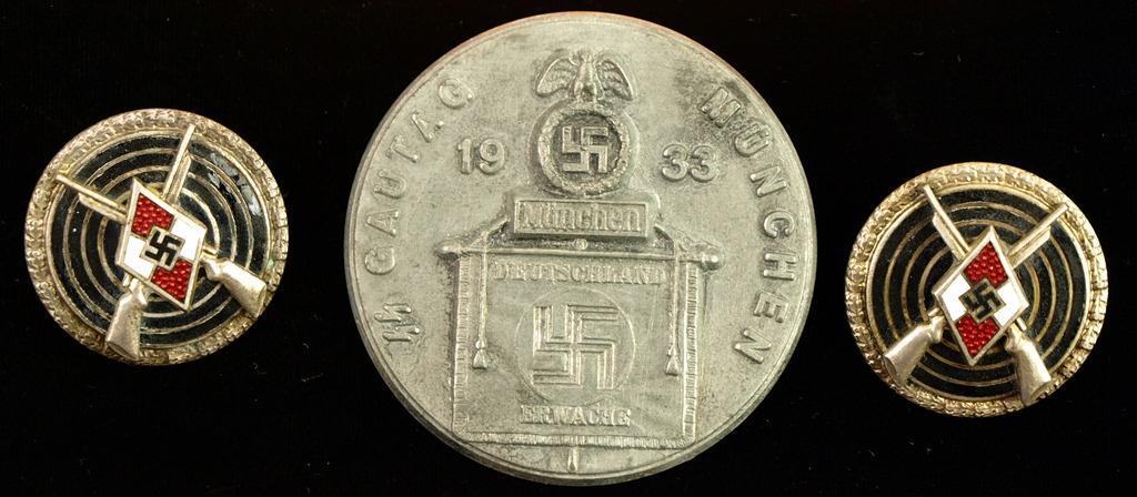 two Hitler Youth Marksman badges and 1933 Gautag Munchen pin.