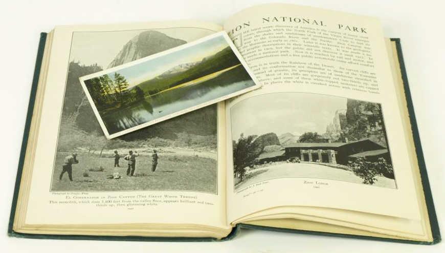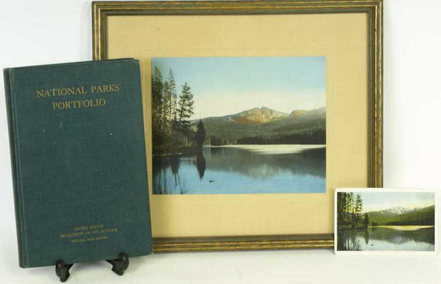 including 1928 "National Parks Portfolio" by Robert Sterling Yard, Hand tinted and signed photo of Top Notch Peak and Sylvan Lake on Cody Rd. in Yellowstone National Park which is signed Haynes in the lower right and early postcard of the same scene.