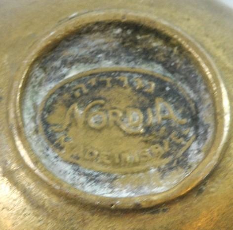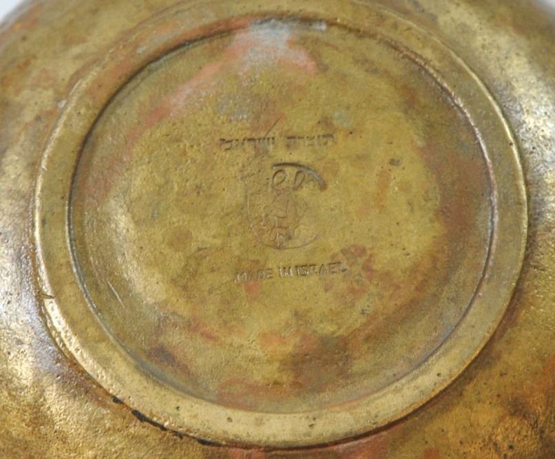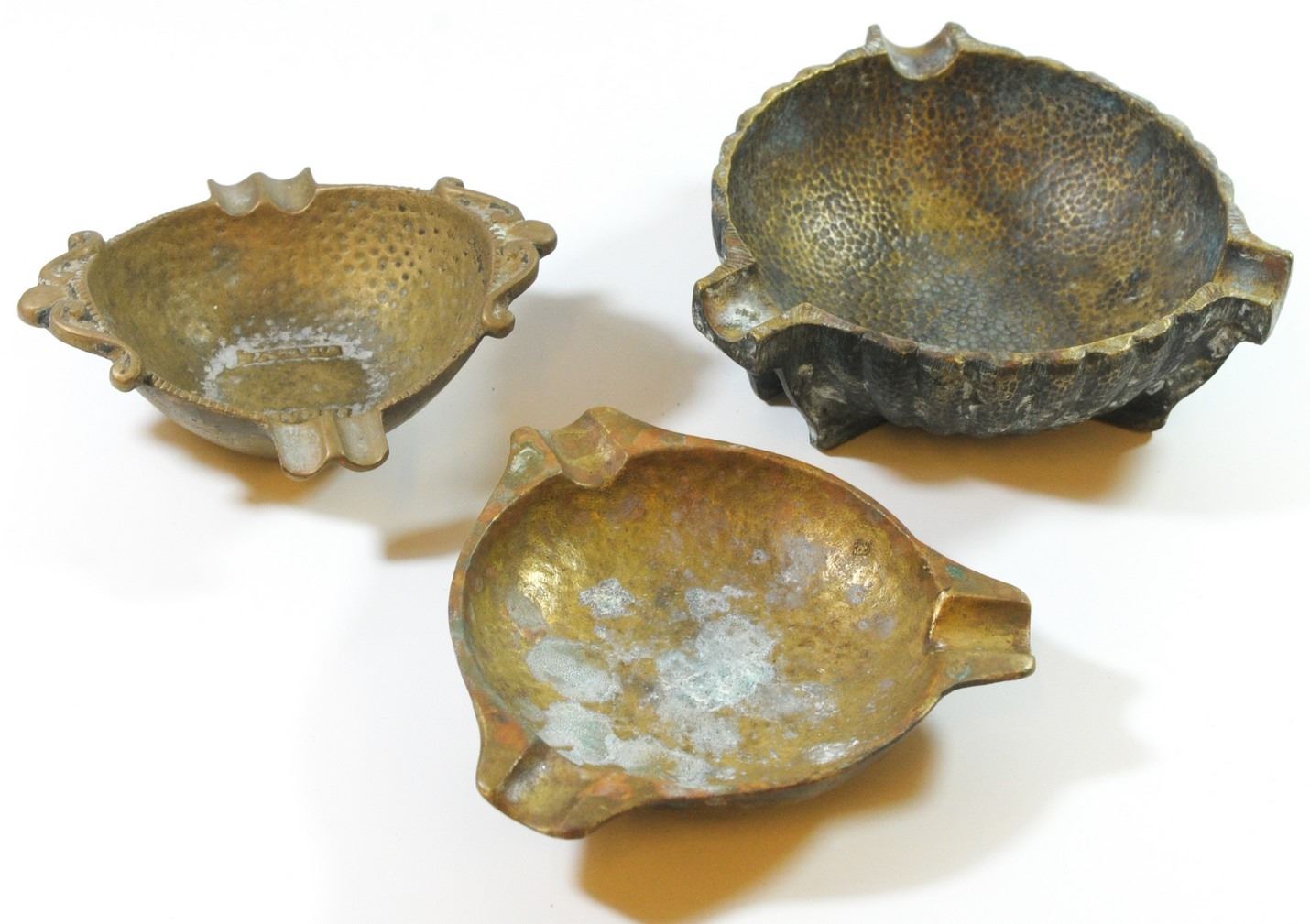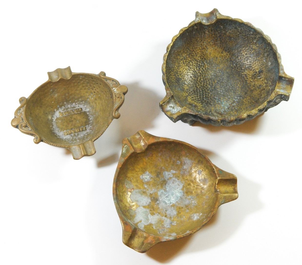 Collection of 3 old Israeli brass ashtrays: 1. Ashtray by Nordia, embellished with the inscription 'Israel' in Hebrew and English, signed. 2. Ashtray by Pal Bell Israel, signed, 3. Ashtray by Oppenheim Israel, greenish patina, signed, diameter/length: 11.5-13 cm.