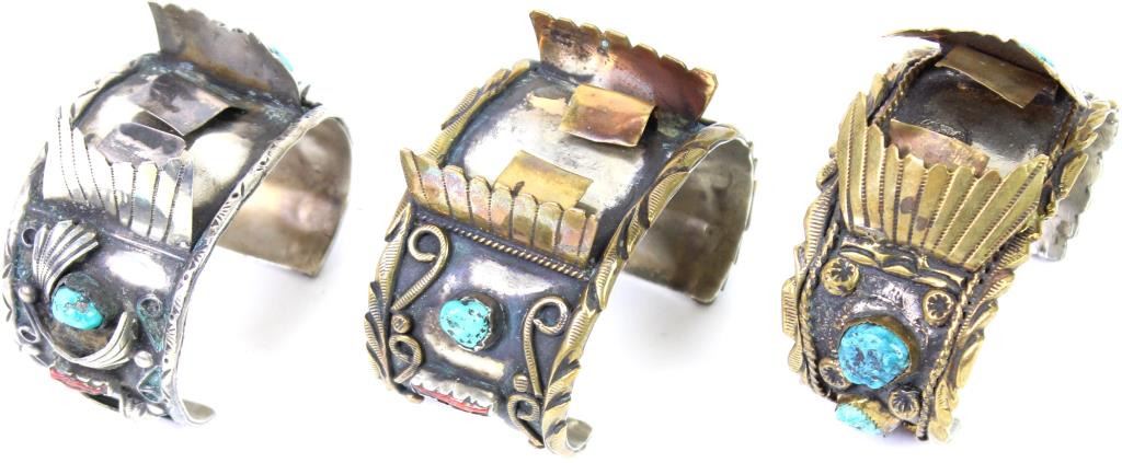 Collection of 3 old pawn Navajo bracelet watch ` bands, turquoise and coral on 2, turqoise only on the third, all show good condition.bands, turquoise and coral on 2, turqoise only on the third, all show good condition.