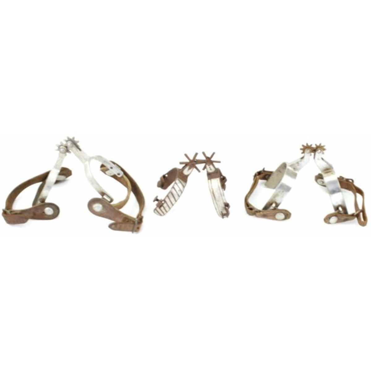 Collection of 3 pairs of spurs includes Kelly's with leathers, aluminum pair of Crocketts with leathers and pair Mexican silver overlay spurs with leathers.