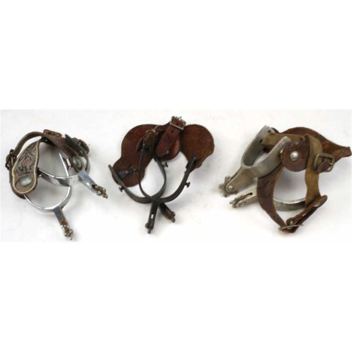 Collection of 3 pairs of spurs includes aluminum Crockett's with leathers, Kelly drop shanks with leathers and Kelly #614 spurs with unmarked leathers.