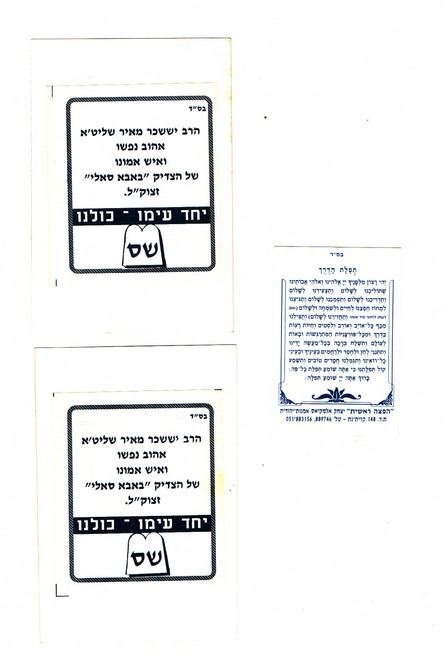 Collection of 3 photos, Tefilat Haderech, Gmar Chatima Tova and a sheet with a special edition postage stamp of the Baba Sali. Very good conditions.