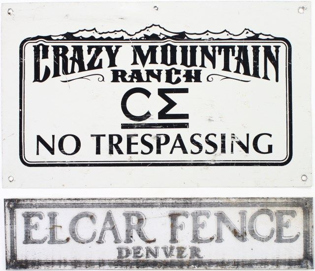 Crazy Mountain Ranch with brand and NO trespassing 9" X 15" and a Elcar Fence Denver 3 1/5" X 15". NO Fishing NO Hunting Five Bar Six Ranch 6" X 18", both ranch signs from Montana. Est. 100-200