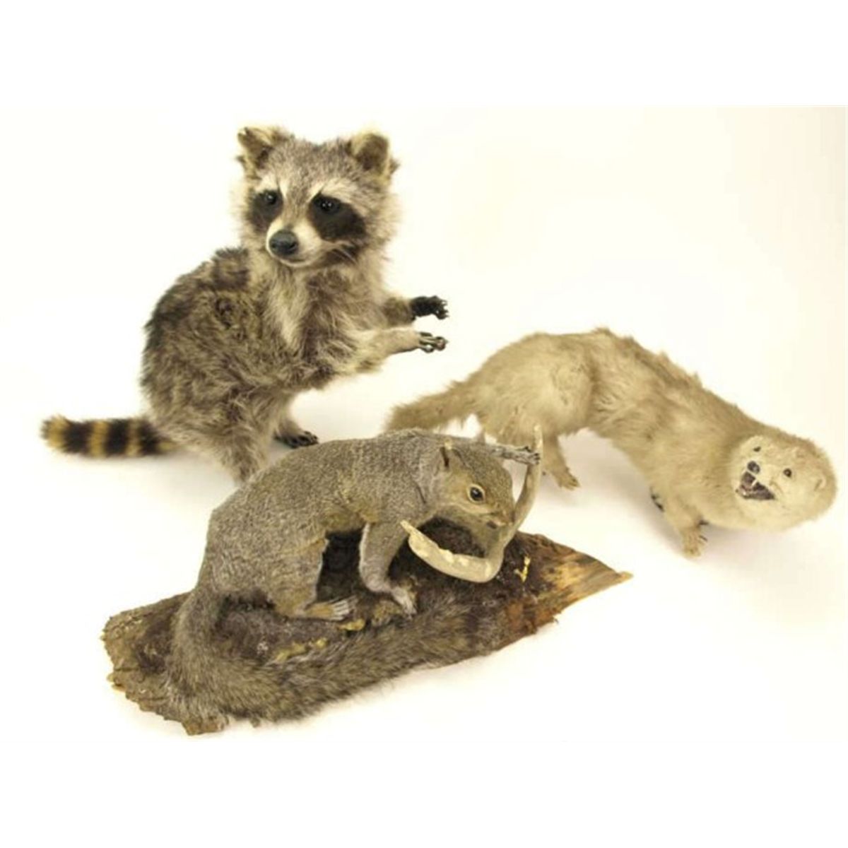 Collection of 3 stuffed mounts includes Gray squirrel , mink and raccoon.