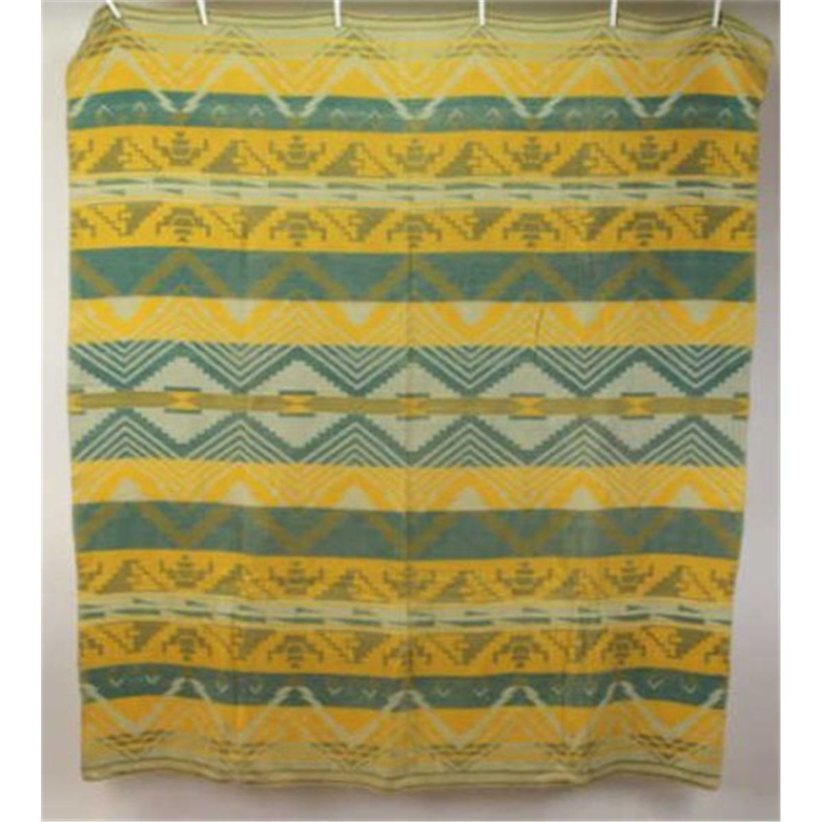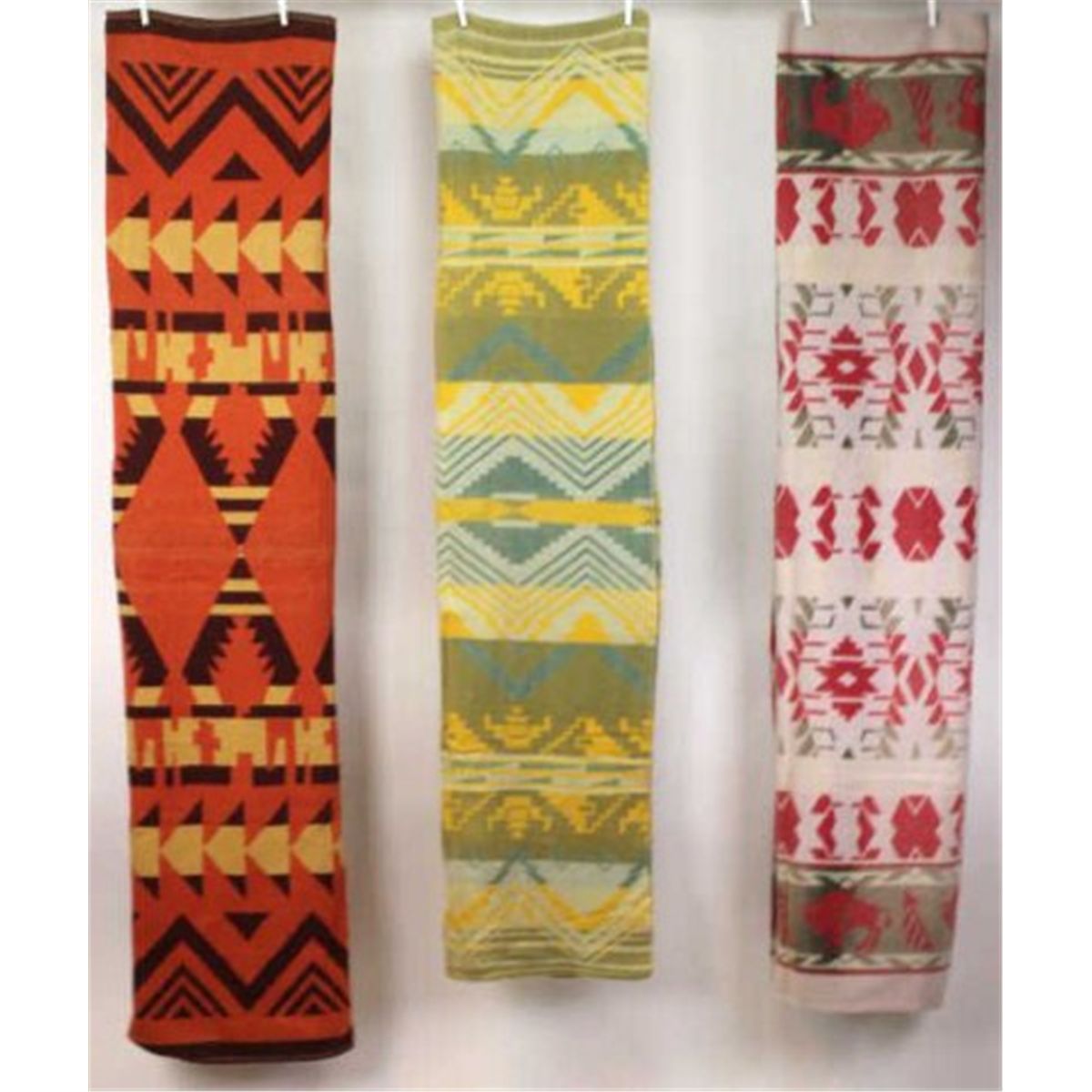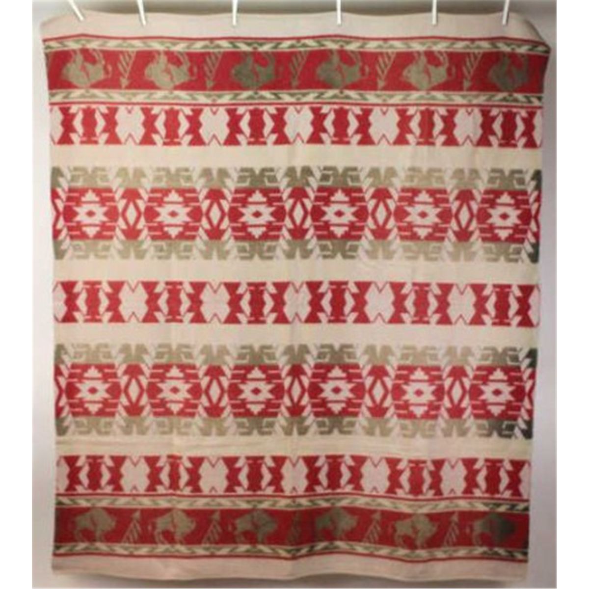 Collection of 3 vintage cotton camp blankets includes a red, white and tan buffalo pattern blanket measuring 60" X 69", another in a geometrical pattern with greens and yellows measuring 57" X 66" and a geometrical pattern blanket with brown, orange