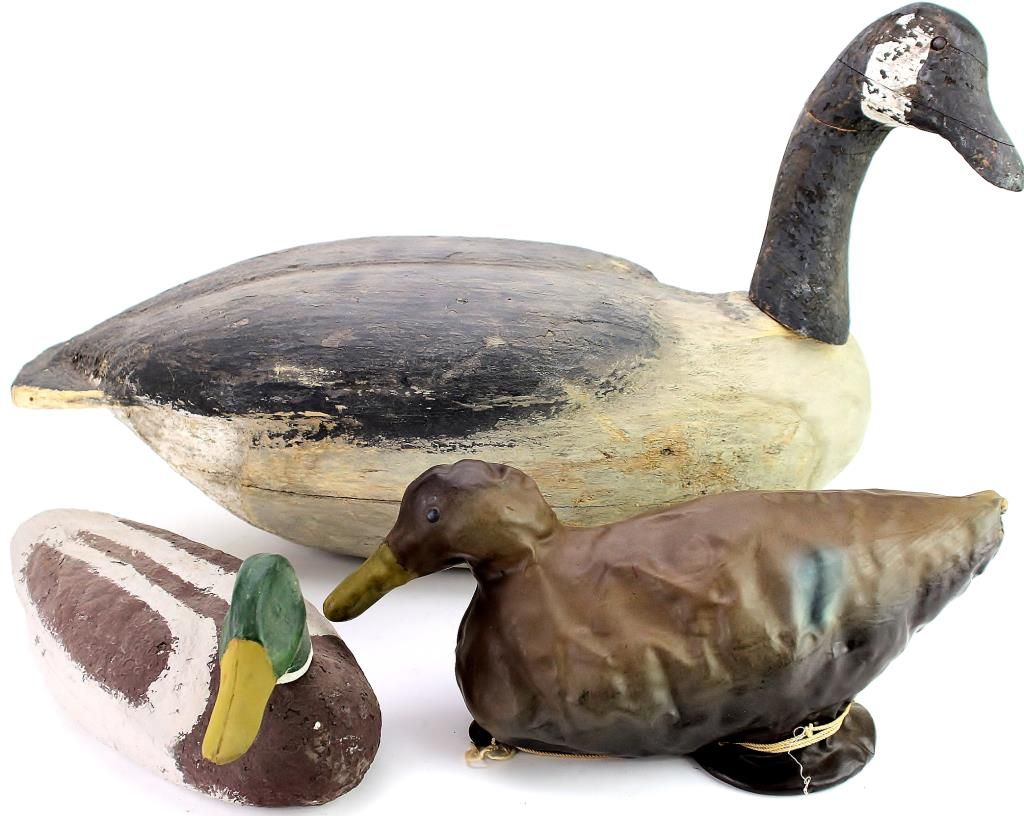 Collection of 3 vintage decoys, 2 duck and 1 goose.