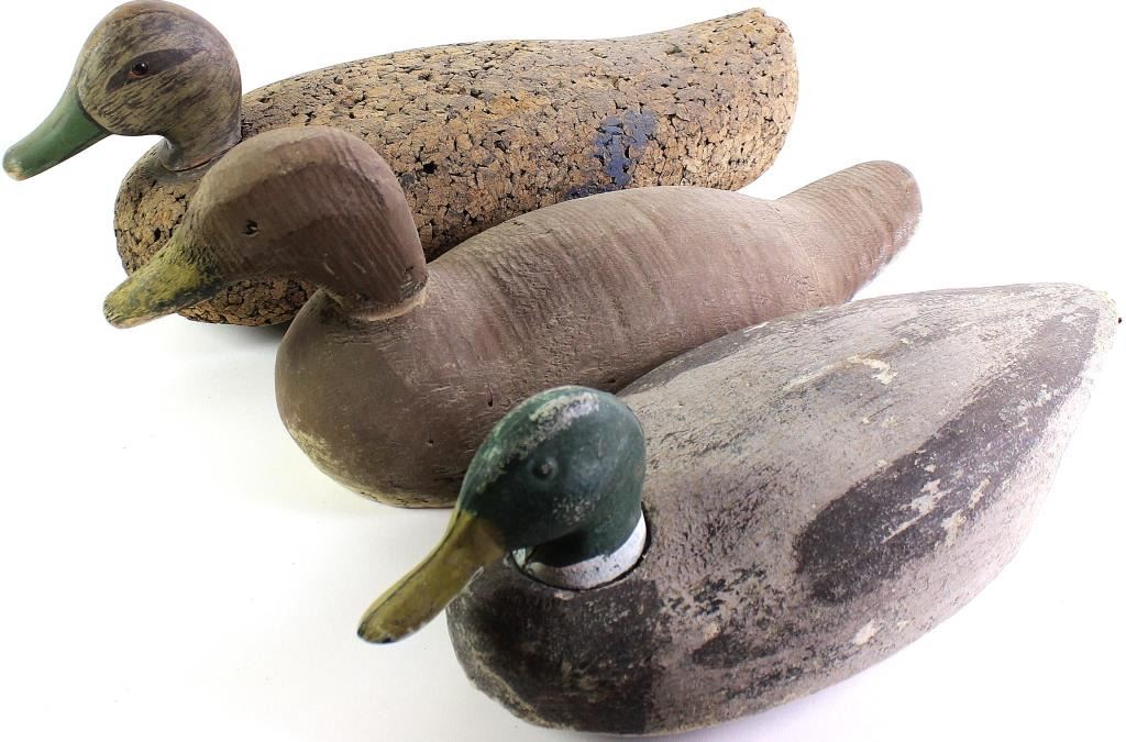 Collection of 3 vintage duck decoys 2) wood, and 1) cork. 2) wood, and 1) cork.