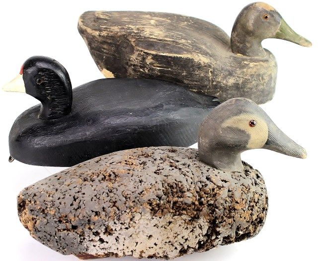 Collection of 3 vintage duck decoys, 2 wood and 1 cork.