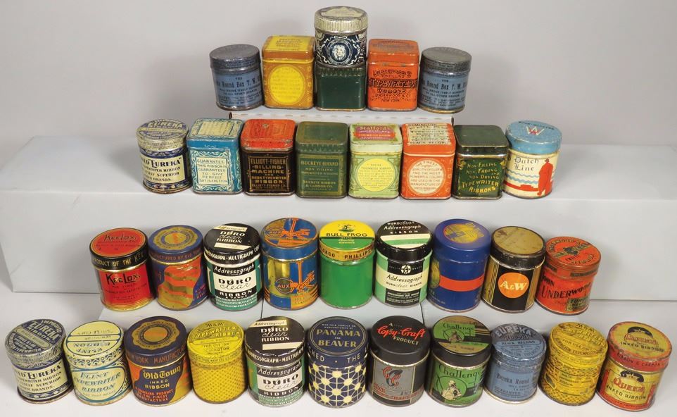 Collection of 34 Early Round and Cube StyleTypewriter Ribbon Tins. (25) Rounds including Panama & Beaver, Eureka, Duro, Old Town, Bull Frog and more. (9) cube style including Stafford's, Philco, Buckeye Brand, Underwood and more. Overall fair to excellent condition. Tallest round measures 2 1/2 inches tall X 1 3/4 inch diameter.