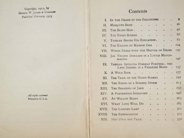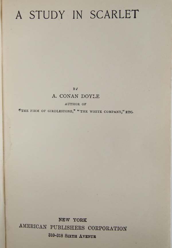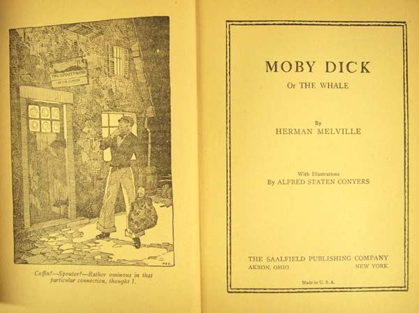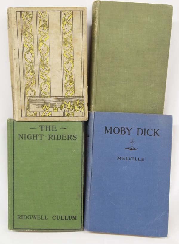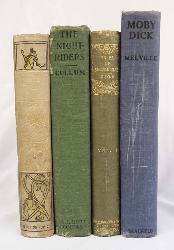 Collection of 4 Antique and Vintage Books, includes #1 Twenty Thousand Leagues Under the Seas or The Marvelous and Exciting Adventures of Pierre Arronax, Conseil, his Servant, and Ned Land, a Canadian Harpooner by Jules Verne, c. 1880 New York: The F.M. Lupton Publishing Company, there is a message written in the back of the book which reads ''Presented to Theady Hamilton on Christmas 1897 From Guy Hamilton'', some wear on inside back spine area. #2 The Night Riders by Ridgwell Cullum, c. 1913 by George W. Jacobs & Company Published February, 1913, inside cover is written ''Merrill S. Rodman 935 Orchard Place Jackson Mich.'' #3 Tales of Sherlock Holmes Vol. 1 A Study in Scarlet by Doyle, Popular Edition c. 1896-1898 American Publishers Corp. #4 Moby Dick or The Whale by Herman Melville with illustrations by Alfred Staten Conyers, c. 1931 The Saalfield Publishing Company, written inside reads ''Jackie from Aunt Evah & Uncle Henry''