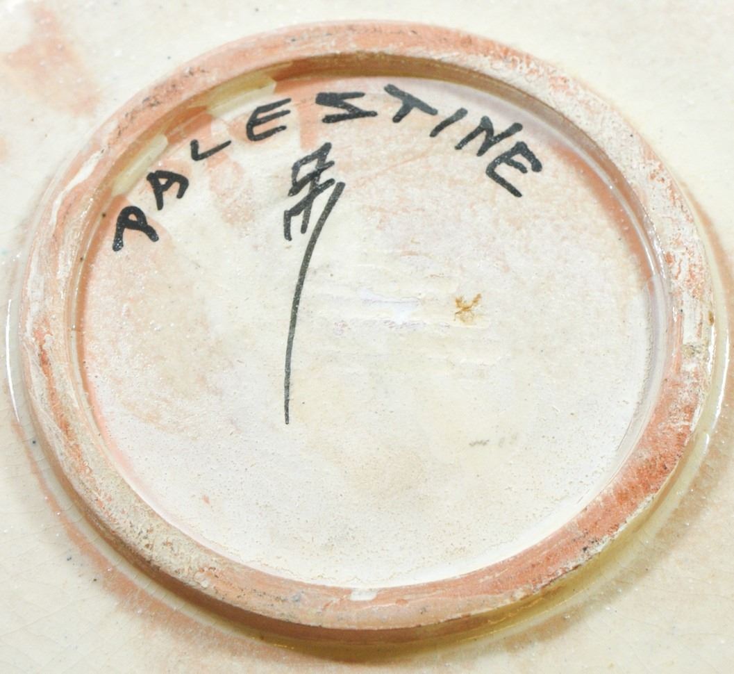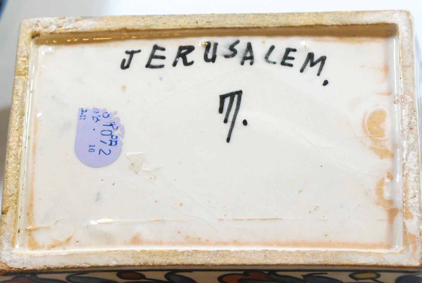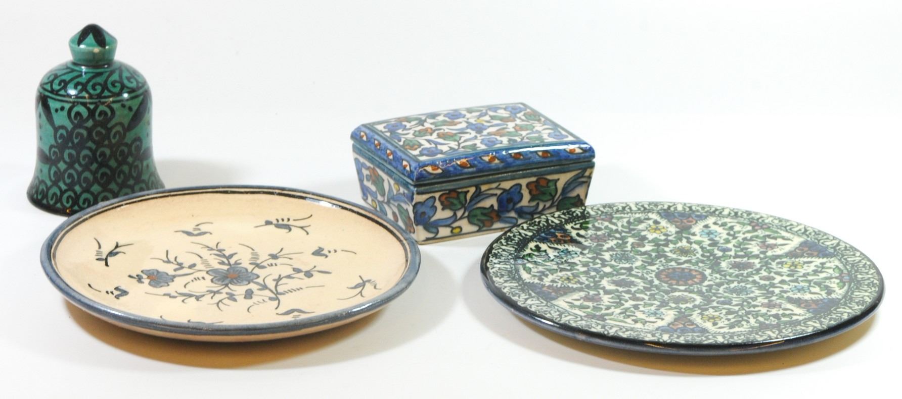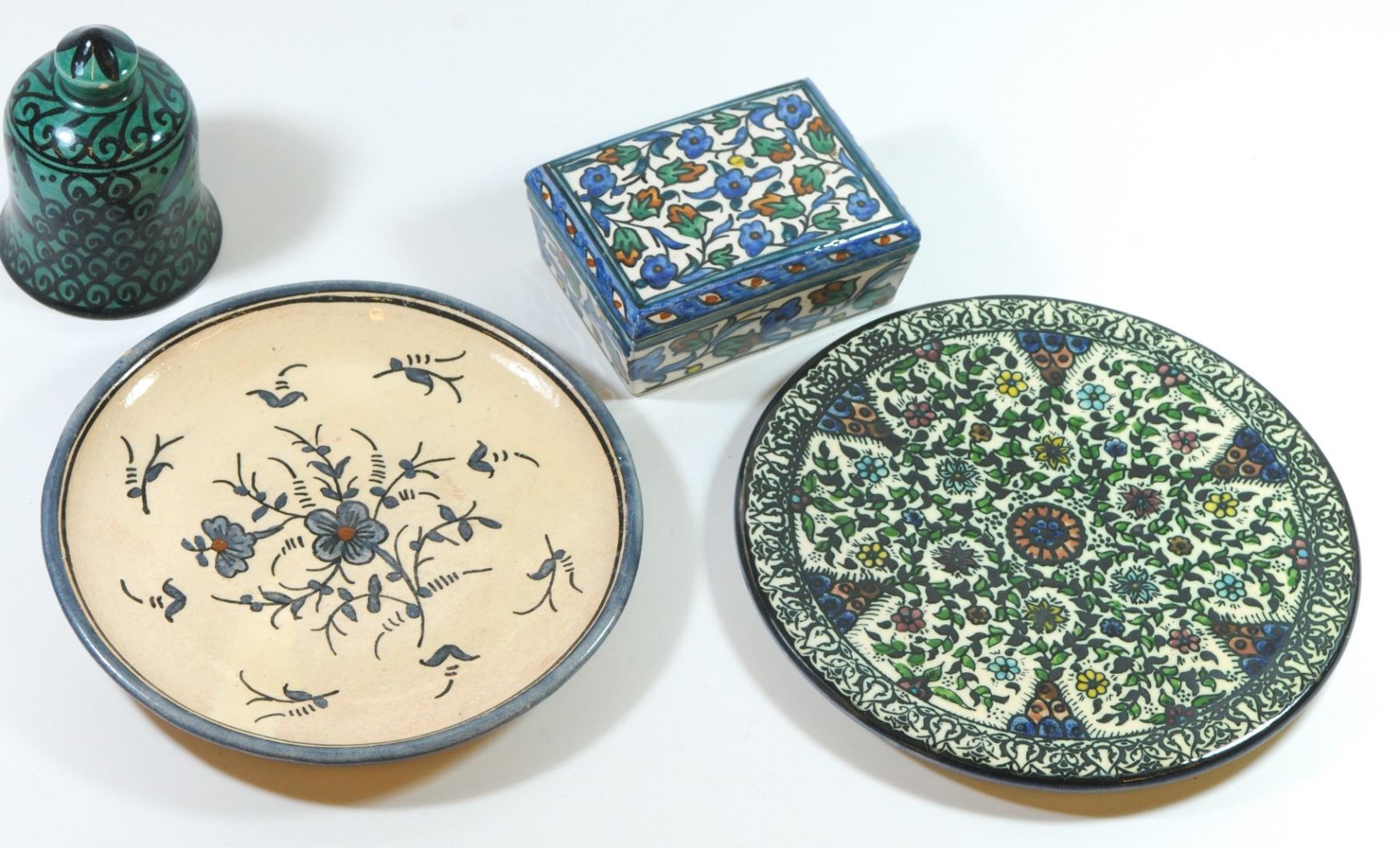 Collection of 4 Armenian ceramic vessels, including 2 plates (one made during Mandatory Palestine), a bell and a box, decorated with hand-painted flowers, signed, diameter of plate: 20-21 cm, height of bell: 10.5 cm, dimensions of box: 12X8.5X5 cm.