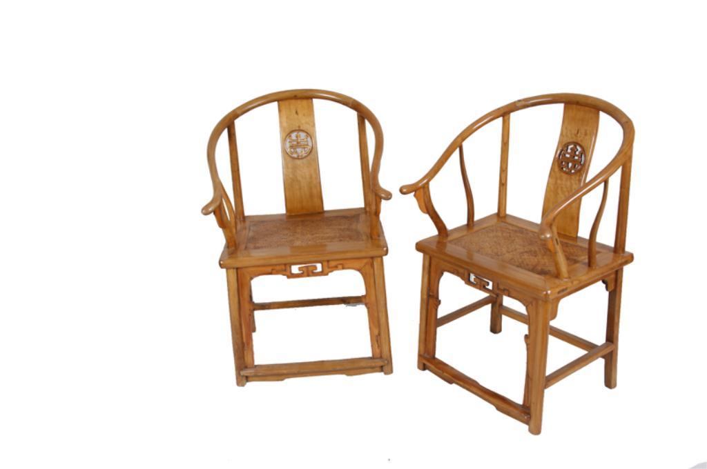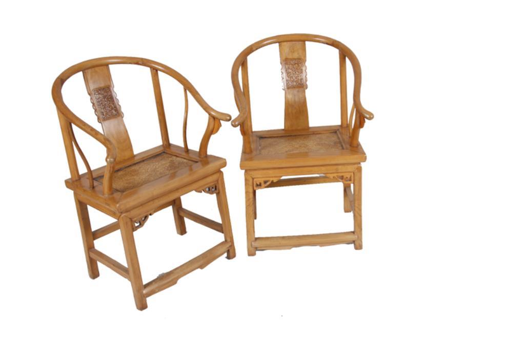 Collection of 4 Chinese Arm Chairs All have natural elm finish, 2 have cloud motif on band rail arms and 2 have a scroll grass motif on arms. All 4 have tightly woven cane seats, horseshoe shaped backs were for people who wore large clothing items or oveAll have natural elm finish, 2 have cloud motif on band rail arms and 2 have a scroll grass motif on arms. All 4 have tightly woven cane seats, horseshoe shaped backs were for people who wore large clothing items or overweight people whichwere a sign of wealth. Only upper class Chinese families were overweight. In overall fair condition, show age cracks. Measures 34"x24"x36".