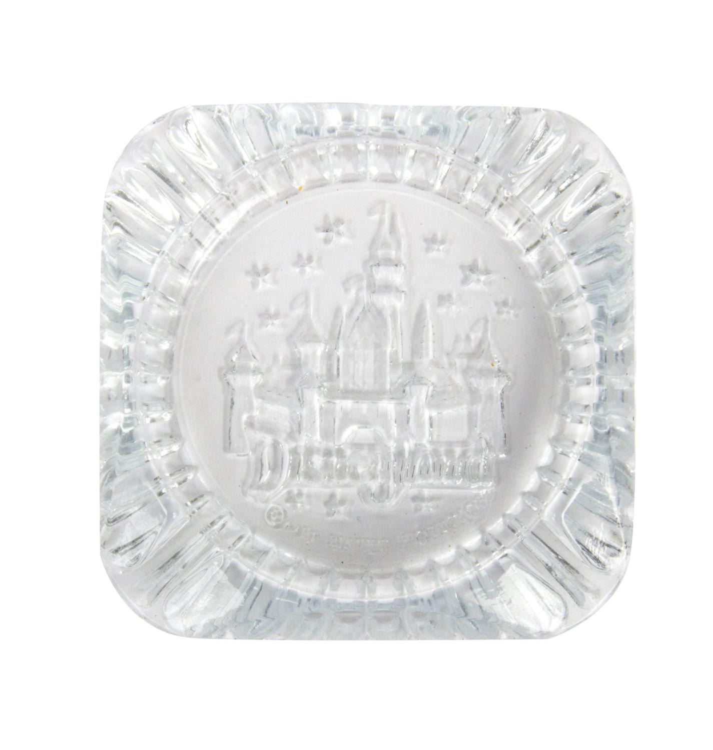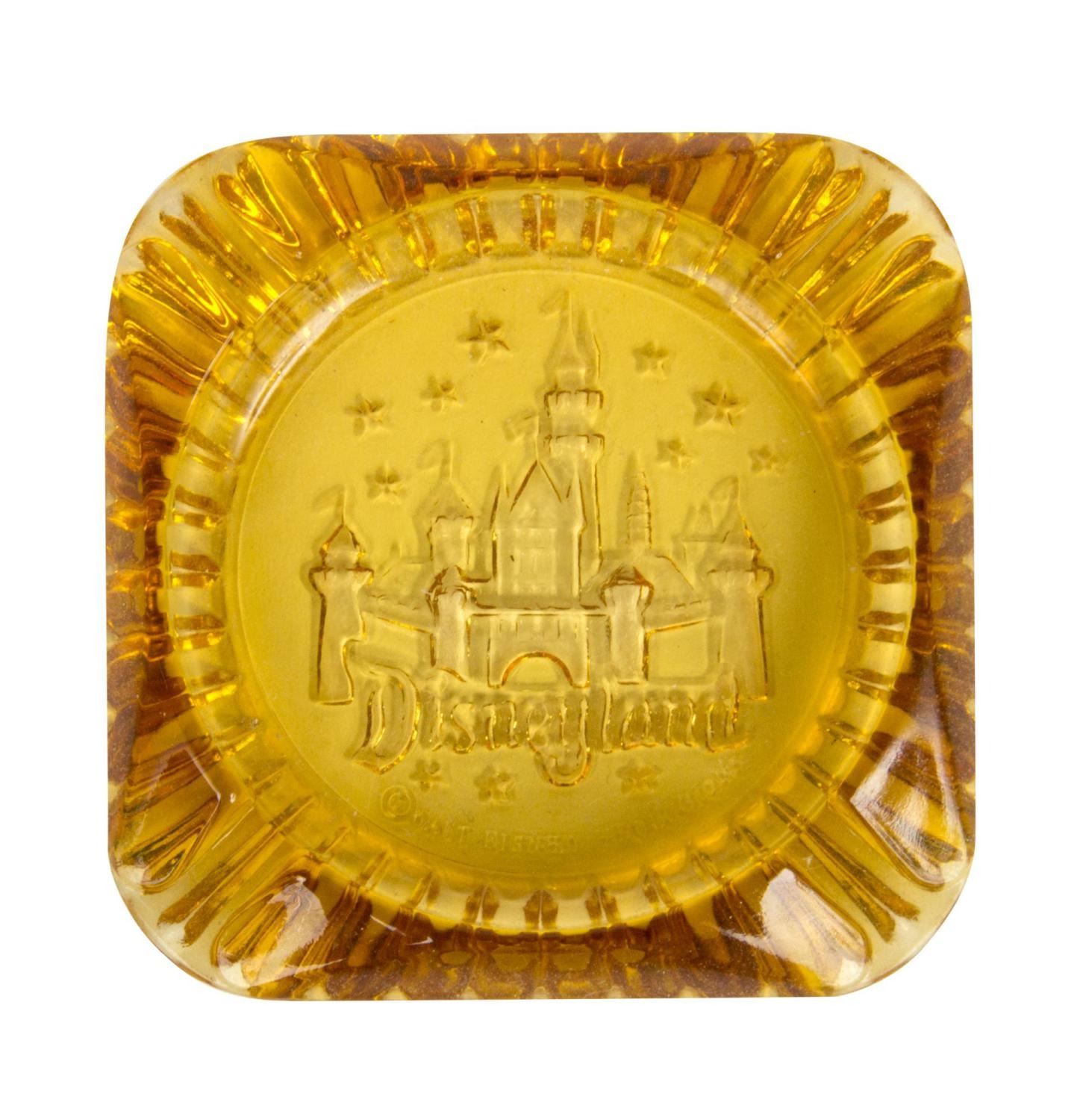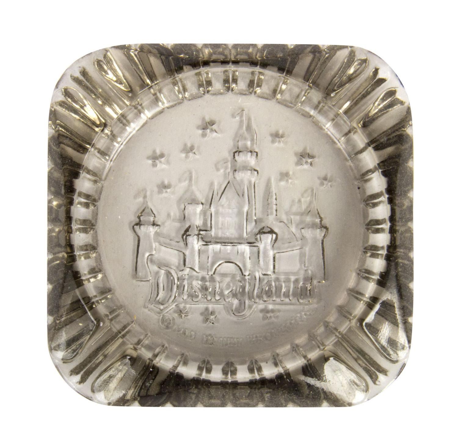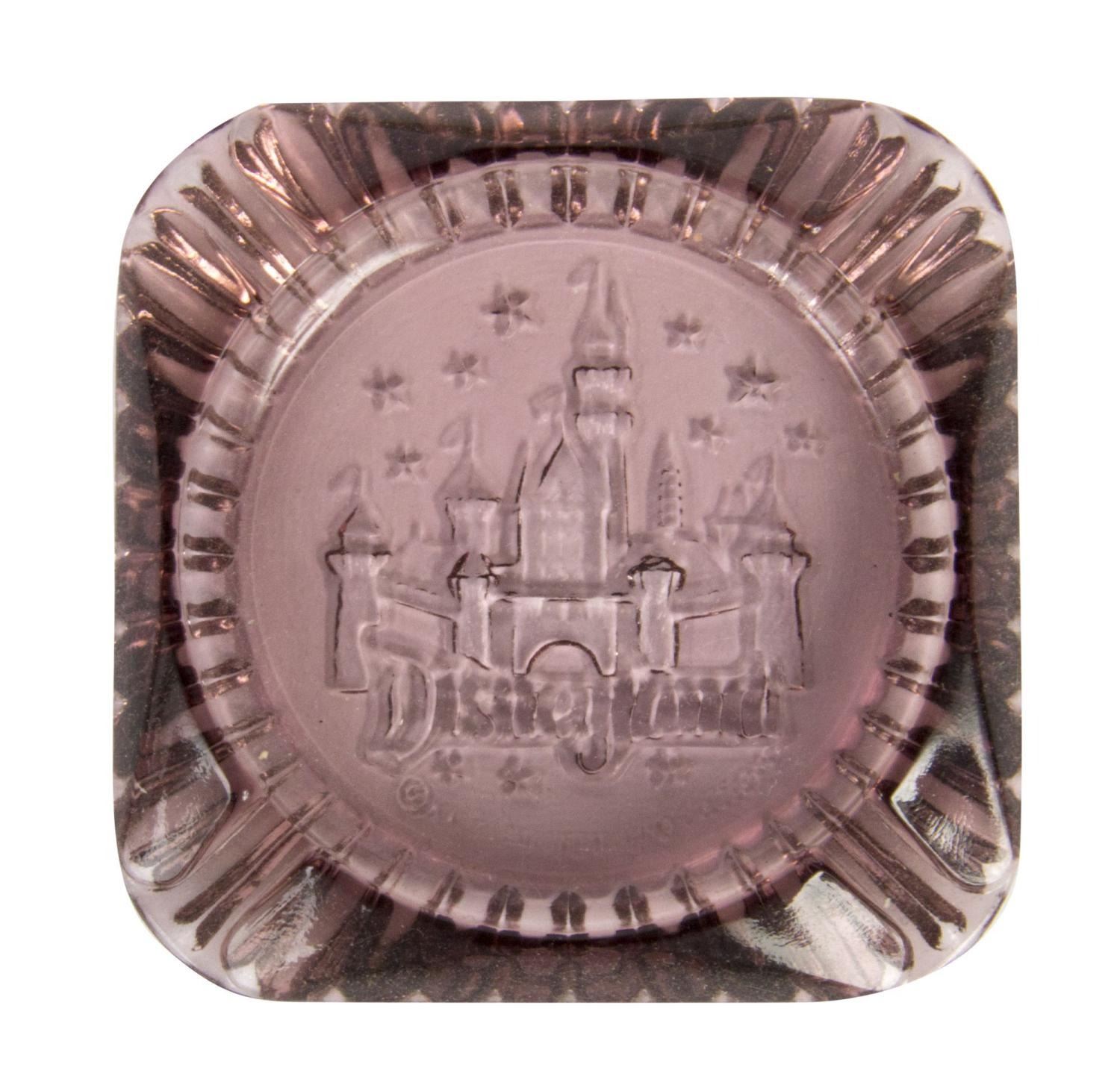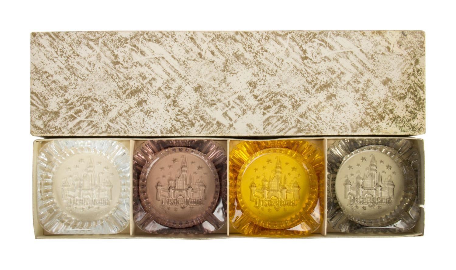 (Disneyland, c.1960s) A collection of (4) souvenir glass ashtrays from Disneyland. The ashtrays feature imagery of the Sleeping Beauty Castle and come in grey, orange, purple and clear. Each measure 3.5"x3.5" and are 0.5" tall. They all are in very good condition with minor wear from use and come in their original box.