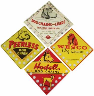 Collection of 4 Dog Chain Display Signs. Peerless, Hodell, Wesco and The George Lawrence Co. Excellent color and graphics. Light scratches otherwise excellent overall condition. Largest measures 10 X 10 inches.