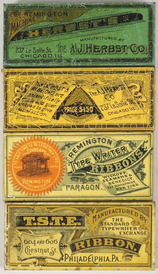 Collection of 4 Early Typewriter Ribbon Tins. T.S.T.E. Ribbon, Herbst's and Remington. Normal crazing otherwise good condition. 3 1/2 X 1/2 X 1 1/2 inches.