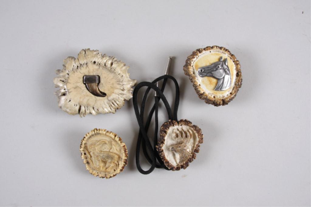 Collection of 4 Folk Art Antler Pieces Consisting of an elk bolo tie, a belt buckle with a bear claw