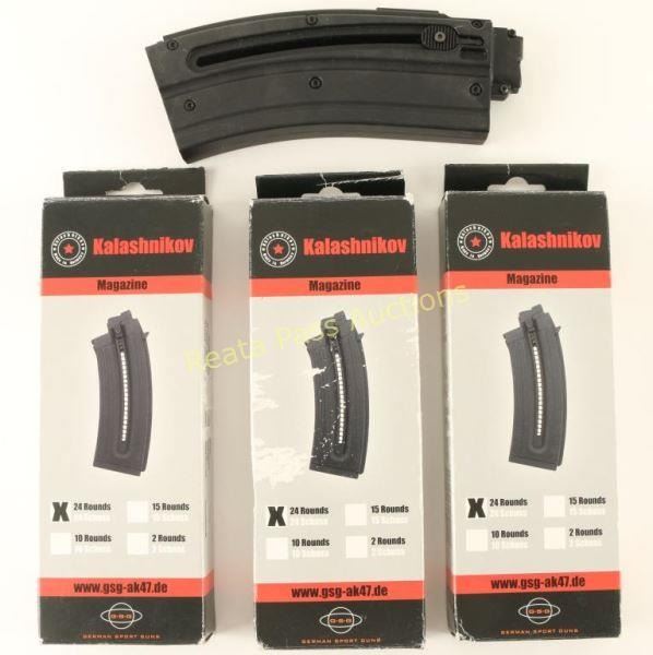 German made 24 round .22 LR Kalashnikov magazines, three in box and one loose. All in very good condition.