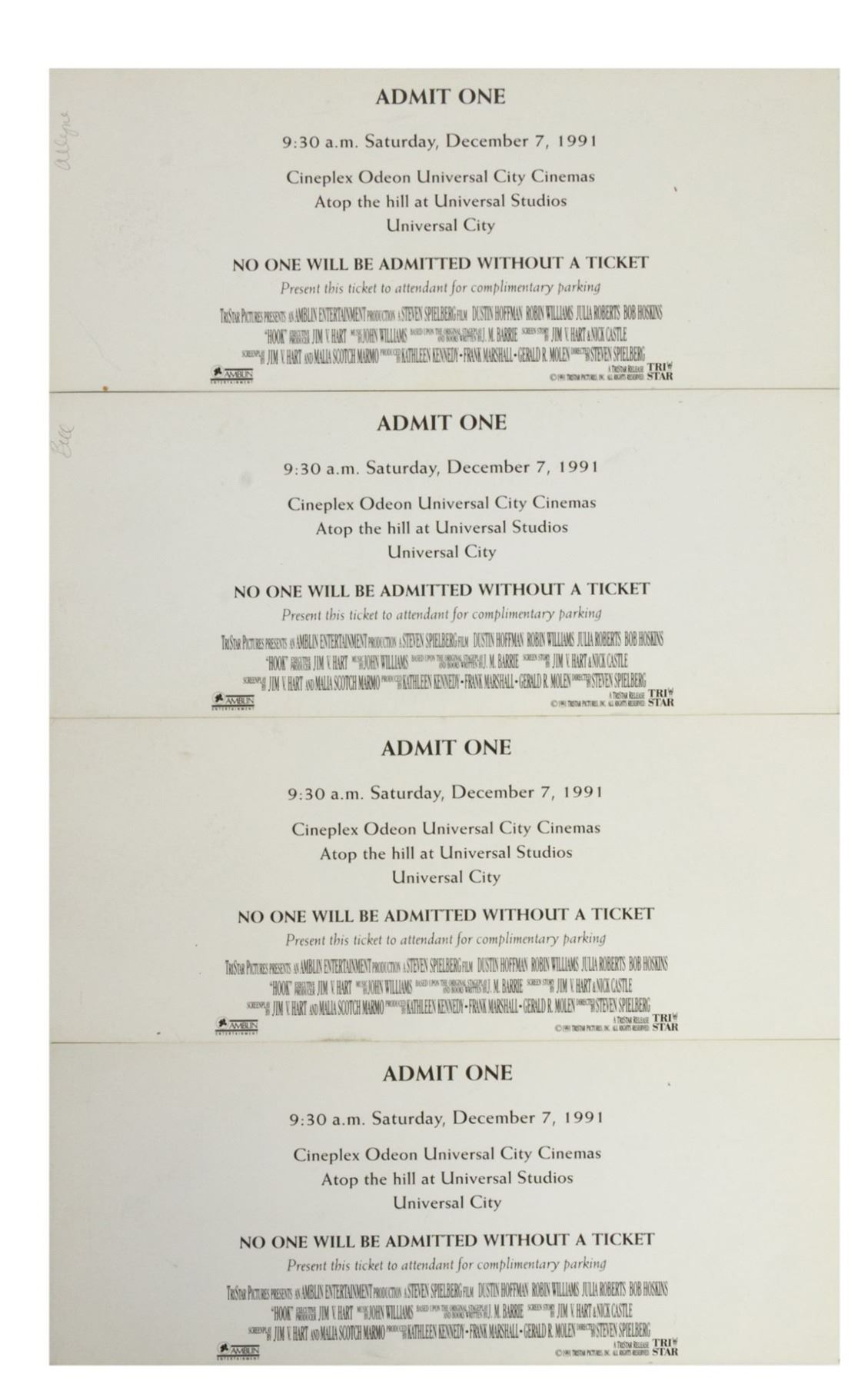 (Amblin, 1991) A collection of (4) special admission tickets to a unique pre-lease viewing party of Hook on December 7, 1991. These tickets were for the viewing event a few days prior to the film's official release, and measure 3.5"x8.5". The tickets are in good condition with some scuffing and wear from use, as well as the names "Bill" and "Allyne" written in pencil on two of the tickets.