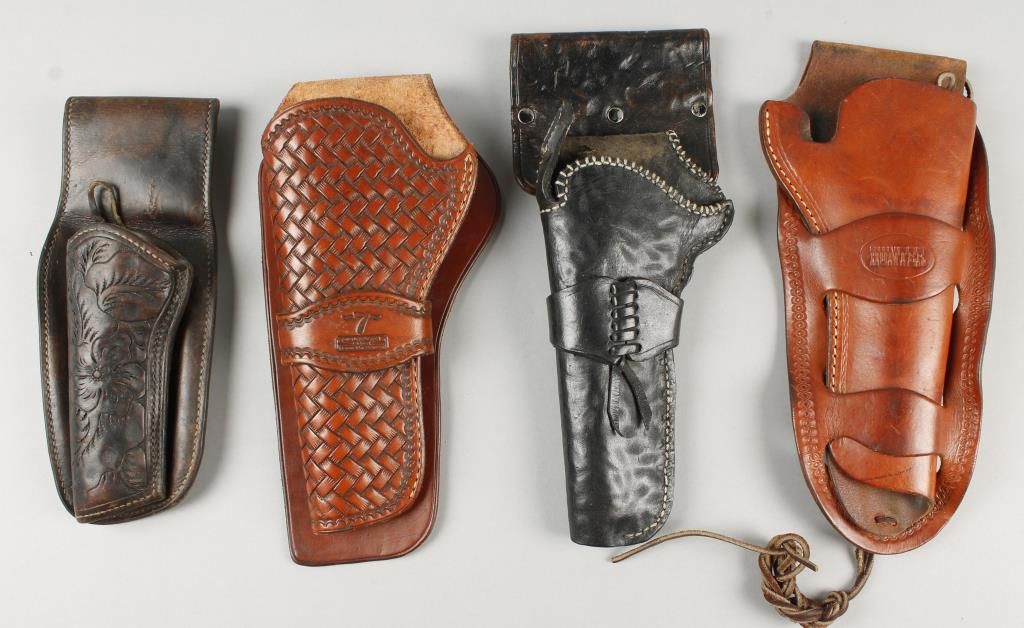 Including: an Antique Hunter for a Bearcat, a Single Action Livingston, a Bill French left handed holster for a Colt single action, and one other black unmarked leather holster.