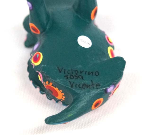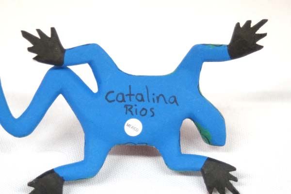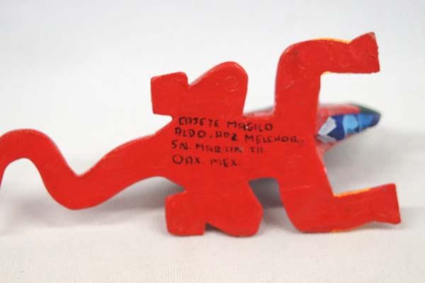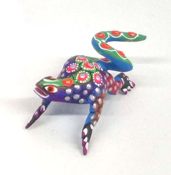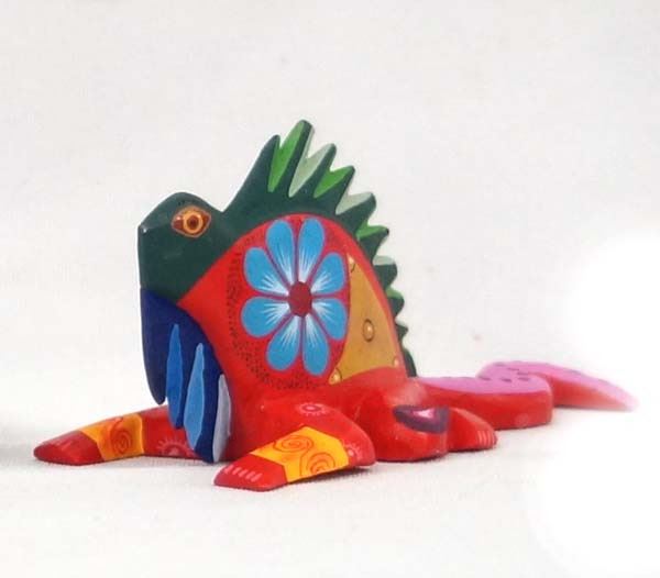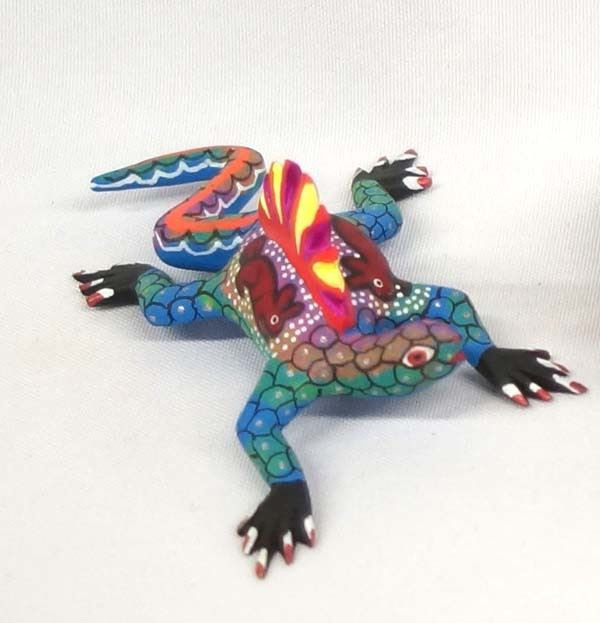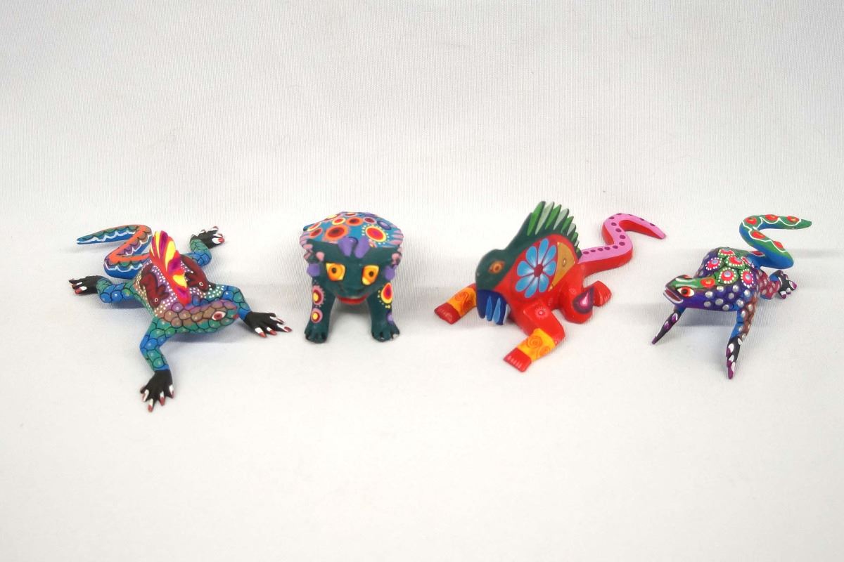 Collection of 4 Mexican Oaxacan Lizard Alebrijes, largest measures 2.5''W x 4.5''L, includes horned toad by Victorino Sosa Vicente, iguana by Aldo Hdz. Melchor, 1 racer by Laura Diaz, and 1 Sail Fin Lizard by Catalina Rios