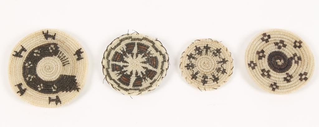 Pima/Papago. White horsehair with black and red designs. (1) with 4 black and red butterflies, 1-1/2" diameter. (1) with a snake and 5 dogs, 2" diameter. (1) with geometric design 1-5/8" diameter. (1) with 10 human figures 1-1/4" diameter. All finely woven and in good condition.