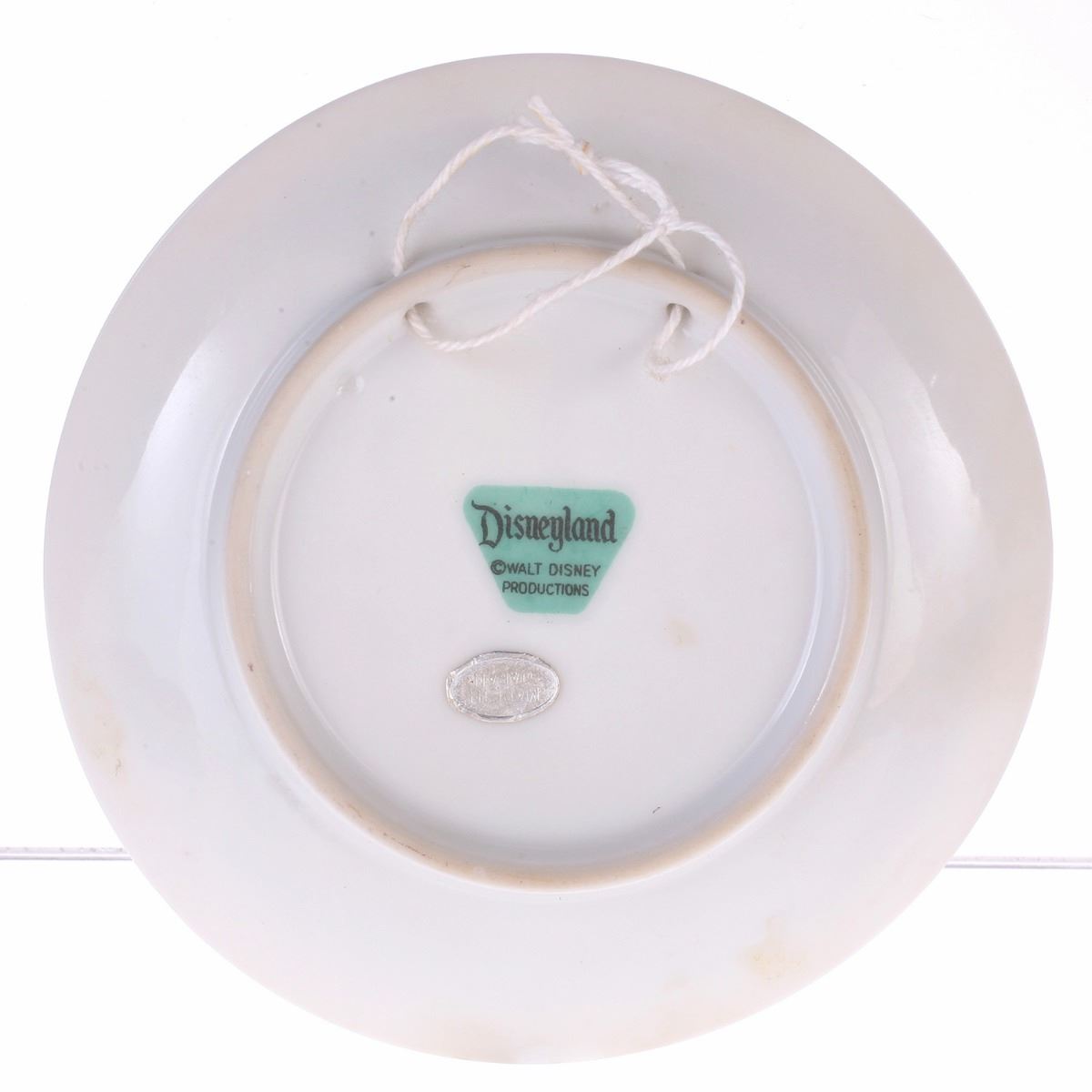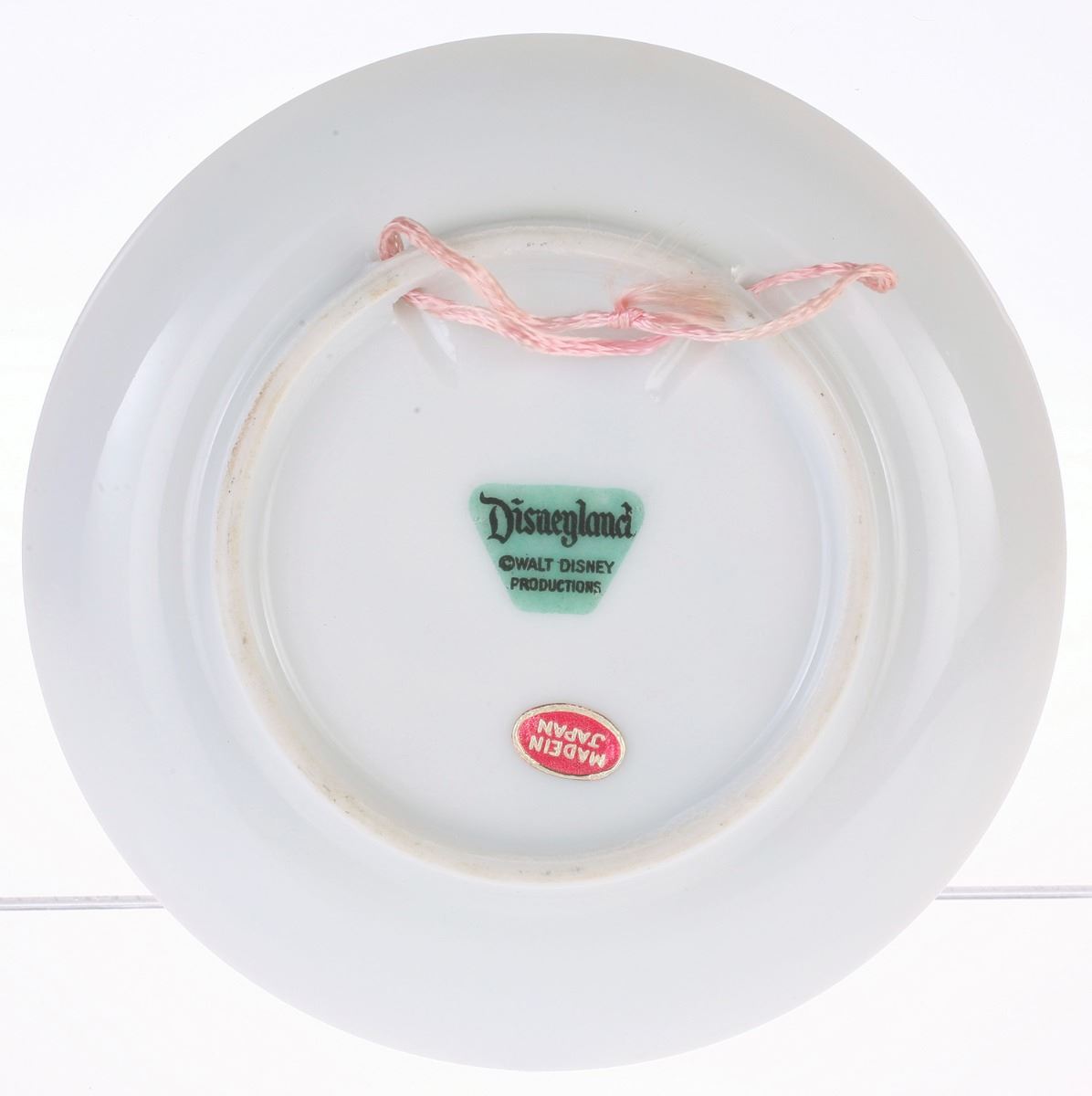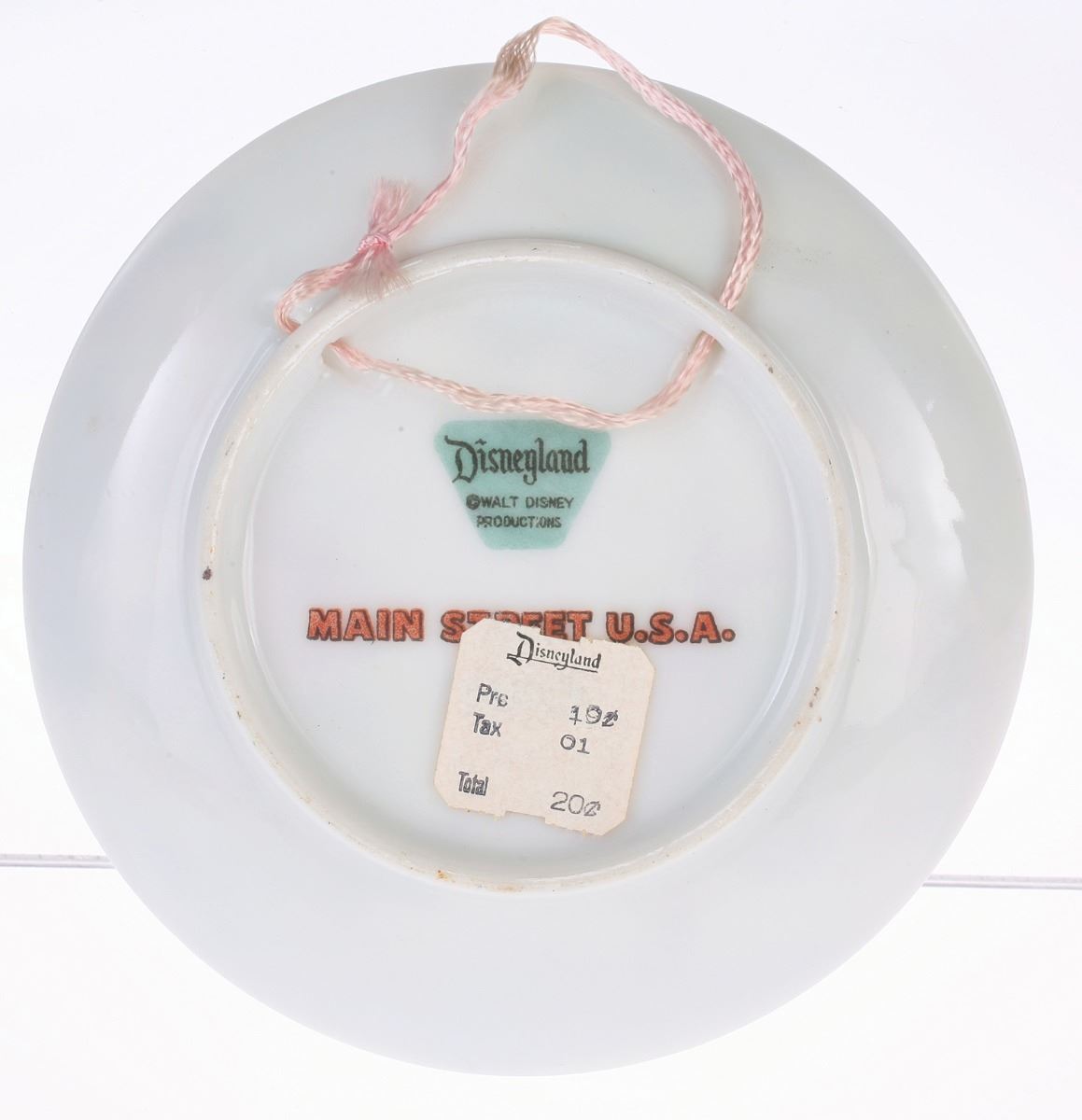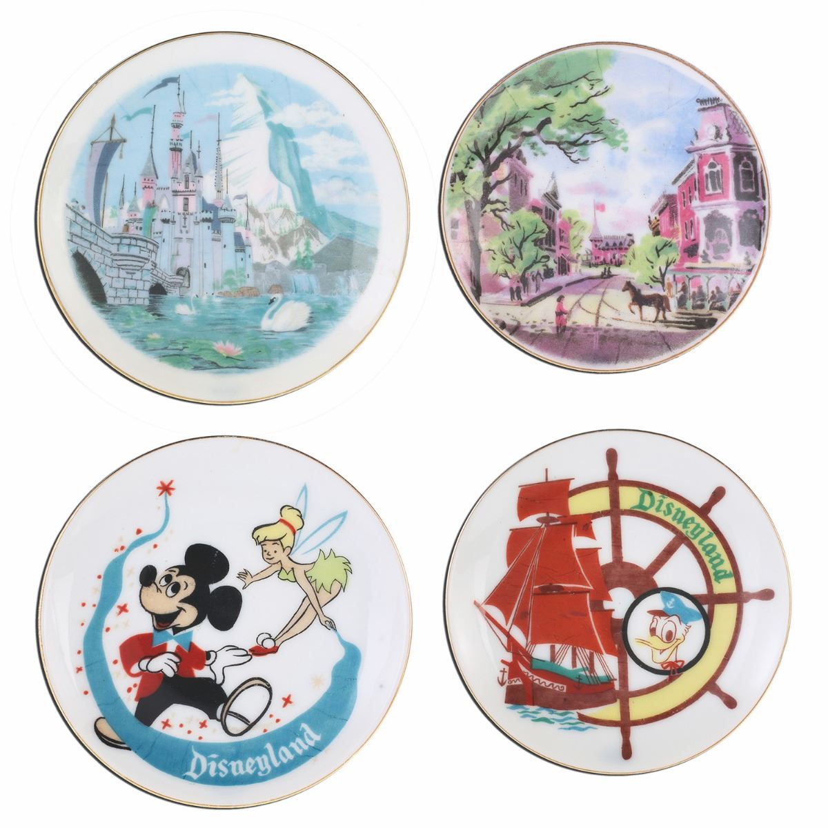 (Disneyland, 1950s) Beautiful collection of (4) miniature hanging wall plates from Main Street. Each plate measures 4" in diameter, and 0.75" tall. Set is in good condition with original stickers on base.