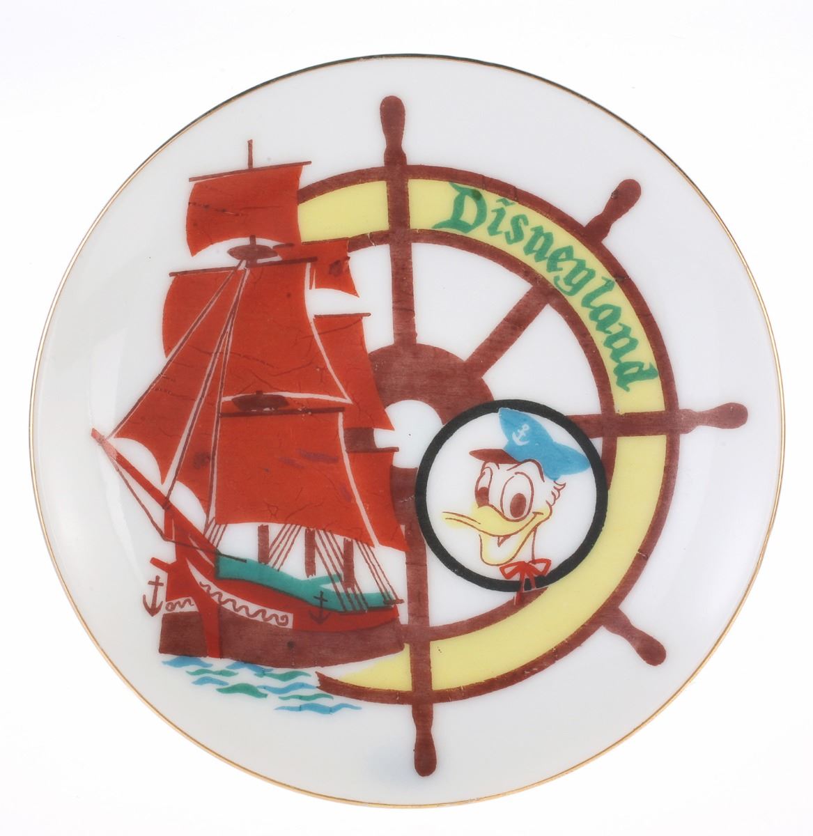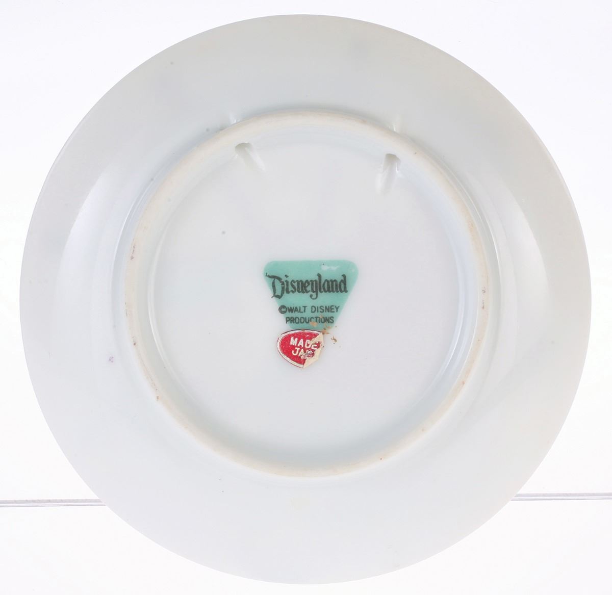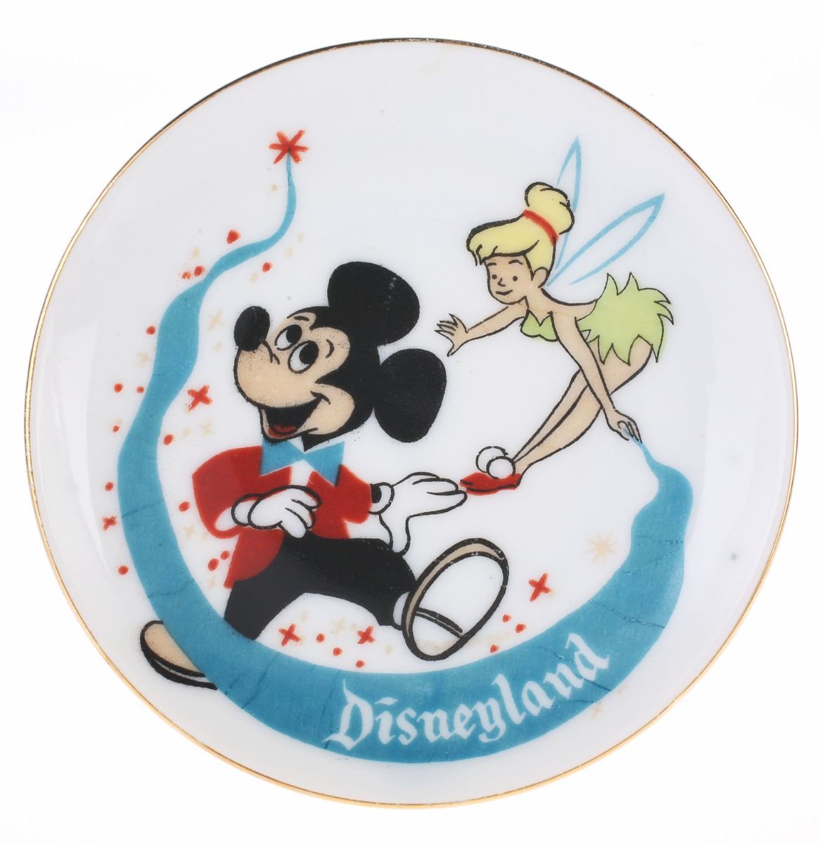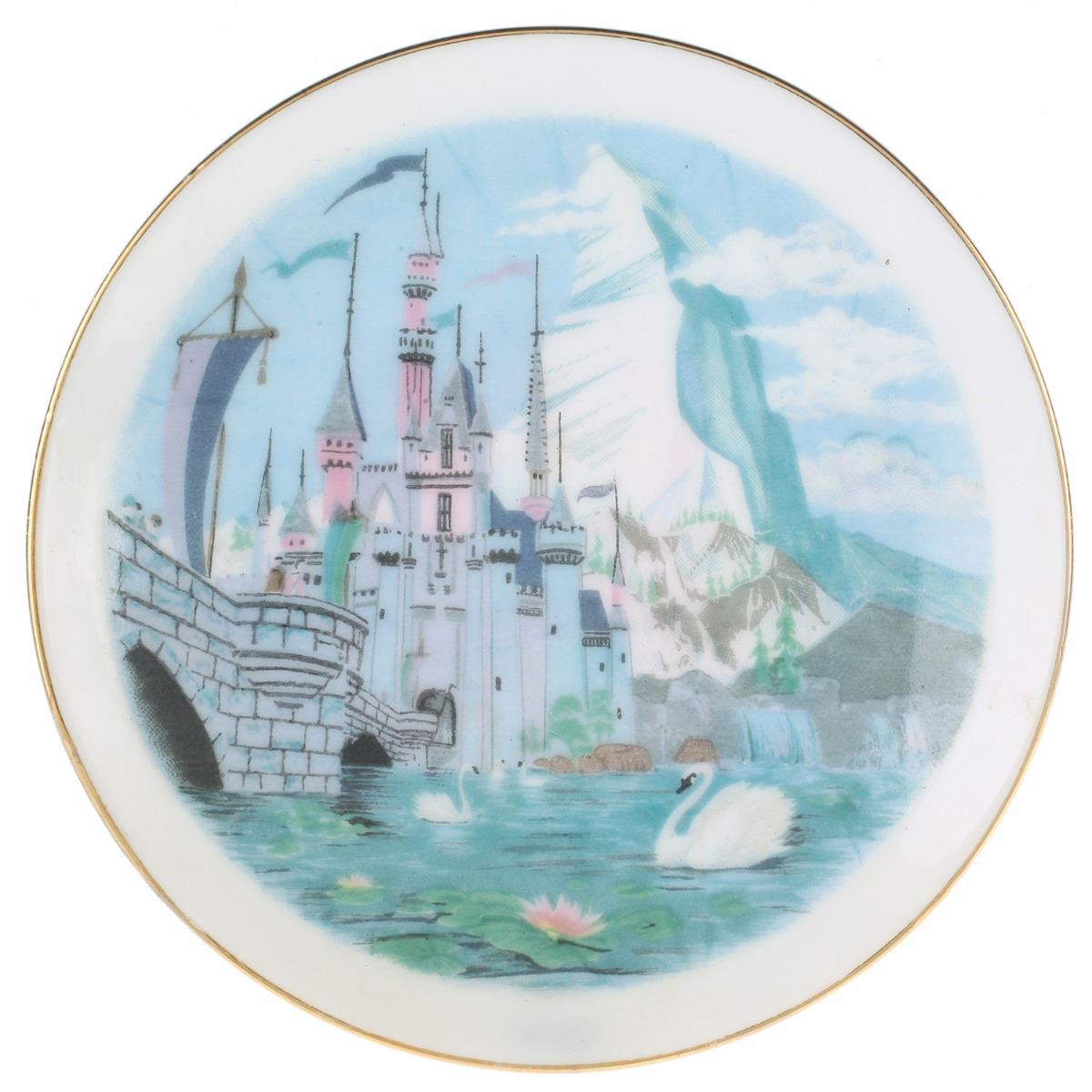 (Disneyland, 1950s) Beautiful collection of (4) miniature hanging wall plates from Main Street. Each plate measures 4" in diameter, and 0.75" tall. Set is in good condition with original stickers on base.