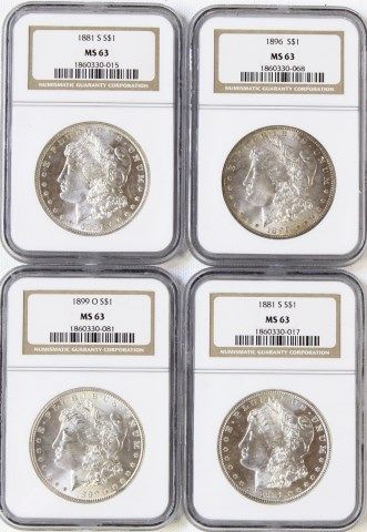 all slabbed and graded MS 63, includes 1881 S, 1896, 1899 O and 1881 S. Est. 125-200