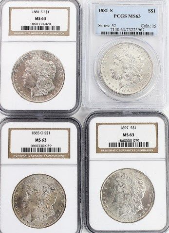 includes 2) 1881 S, 1885 O and 1897, all slabbed and graded MS 63. Est. 125-200