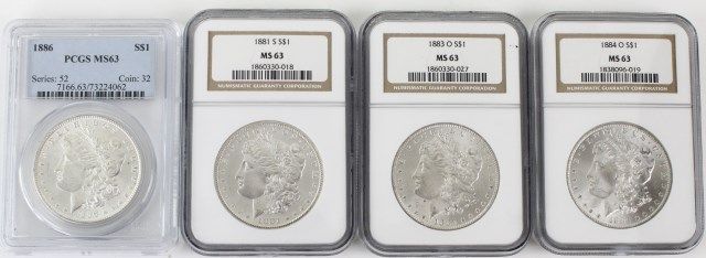 slabbed and graded MS 63, includes 1881 S, 1883 O, 1884 O and 1886. Est. 150-200