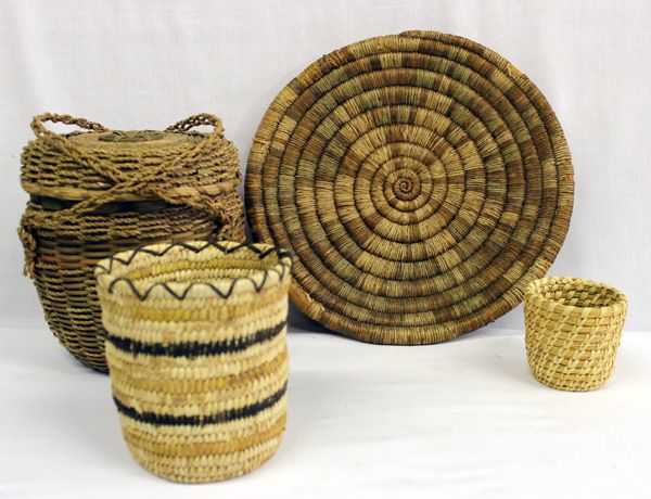 Assortment of 4 Beautiful Baskets. This collection includes, one tricolor basket, one Vintage Hopi Second Mesa flat basket, one Small Tohono O'odham basket, and a handled string basket. Items measure approx.: (Handled basket) 8''H x 8''W, (tricolor) 5''H x 5''W, (Hopi) 3''H x 3''W and the flat bowl is 11.75'' in Diameter and 1''H