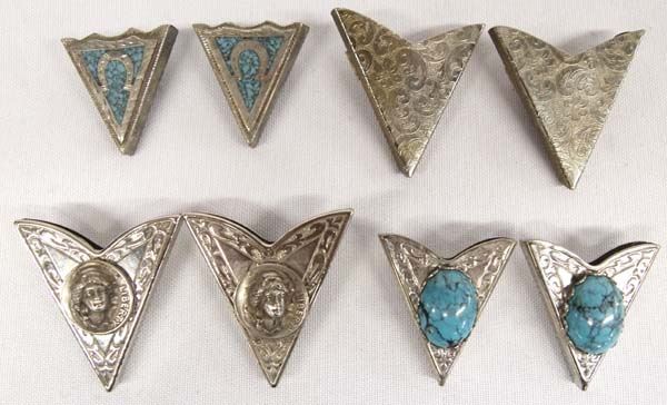 Collection of 4 Pair Southwestern Collar Tips. These sweet pieces have Sterling Silver fronts and nickel backs. The Largest pair measures approx. 2''L x 1.25''W.