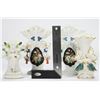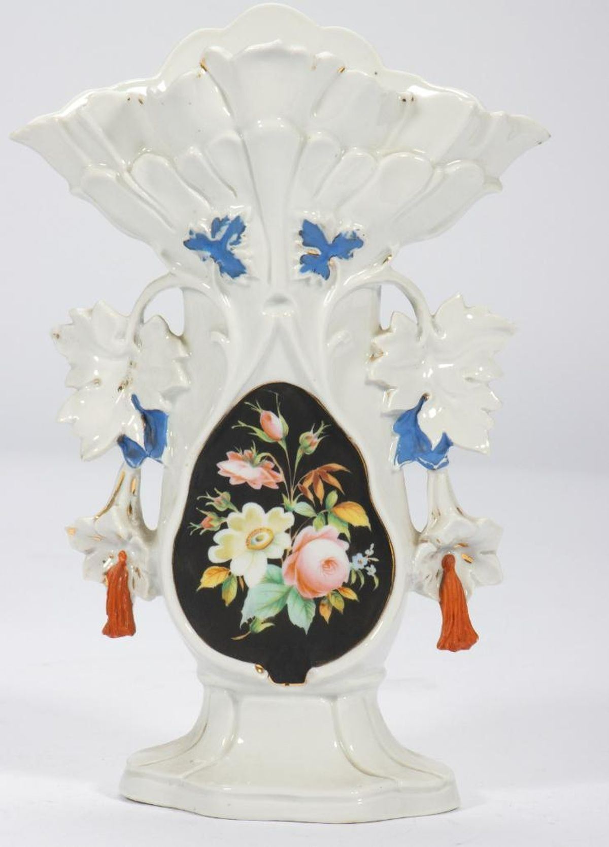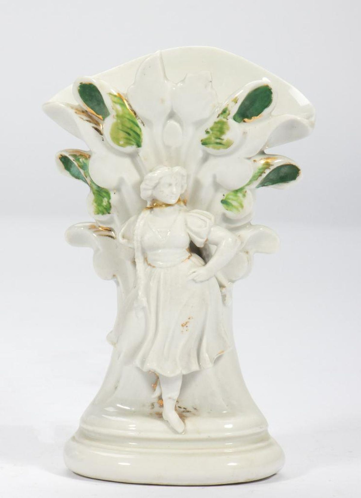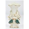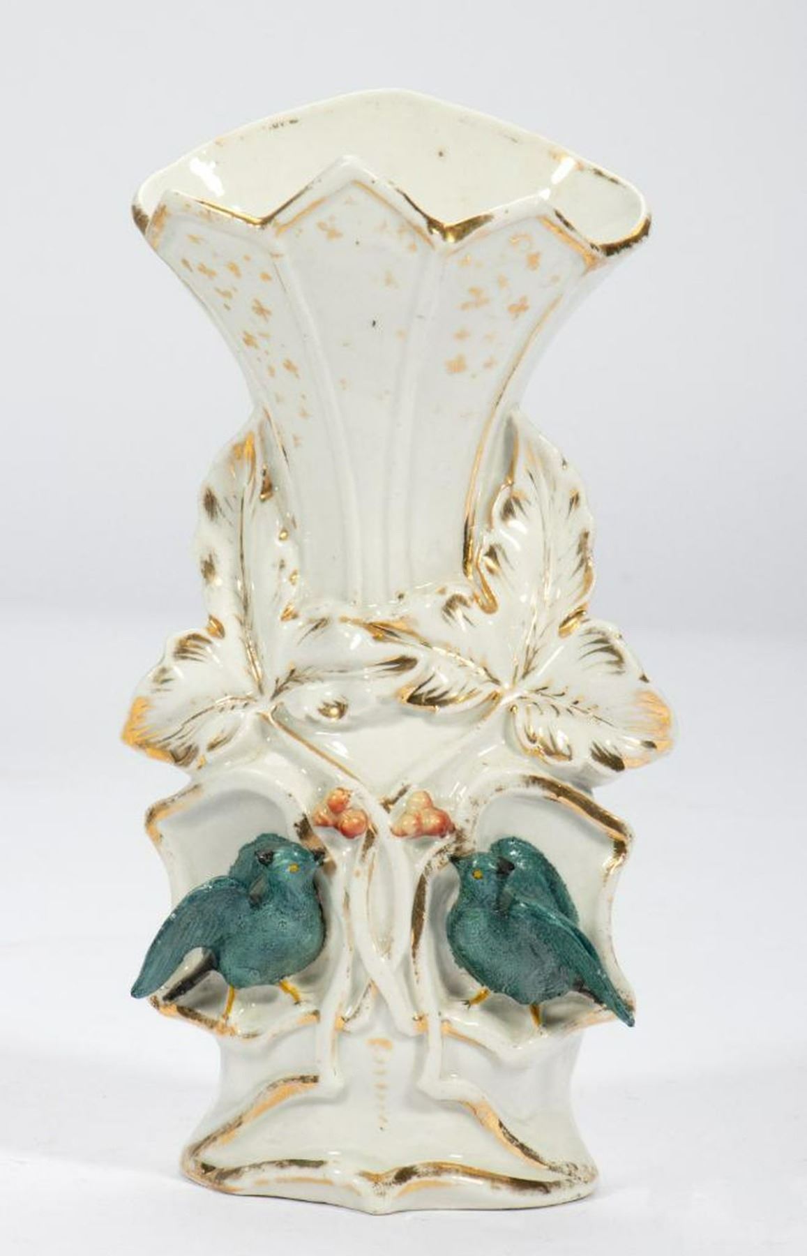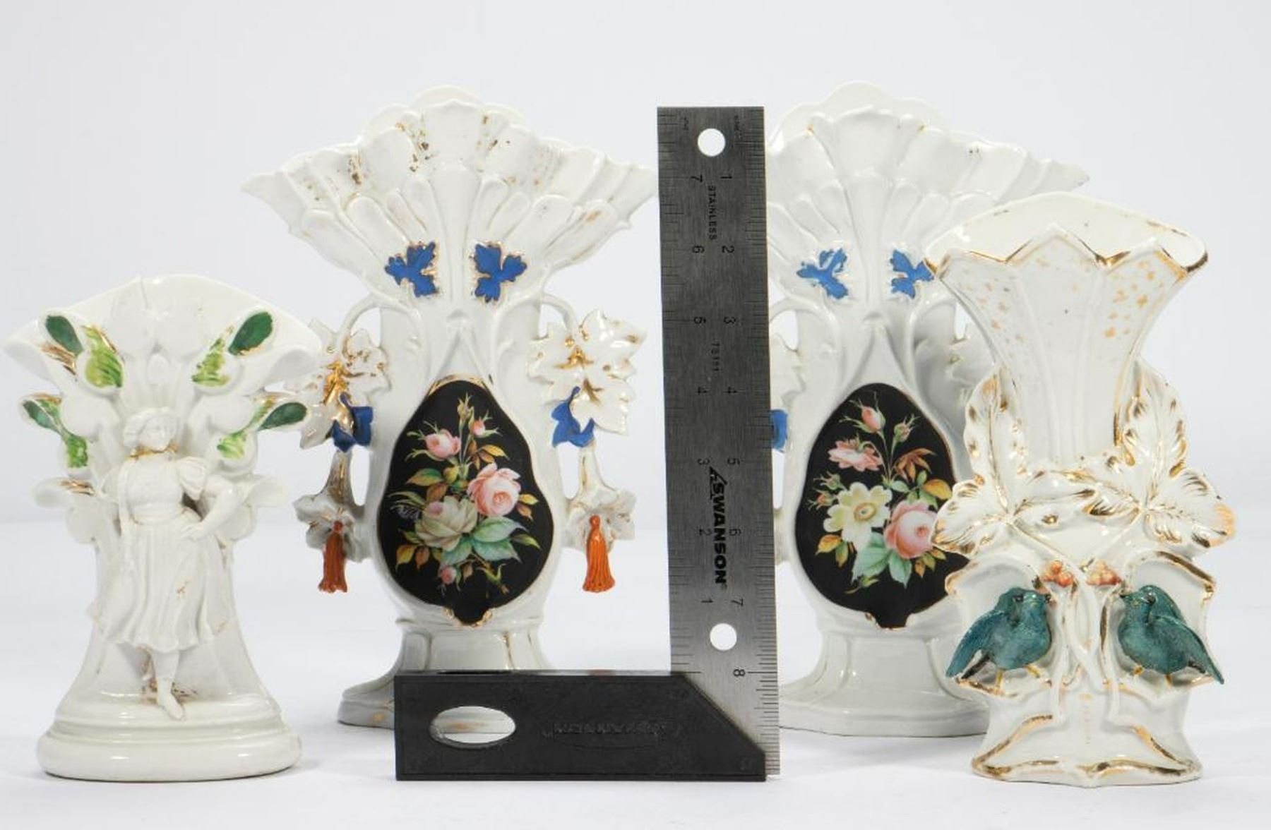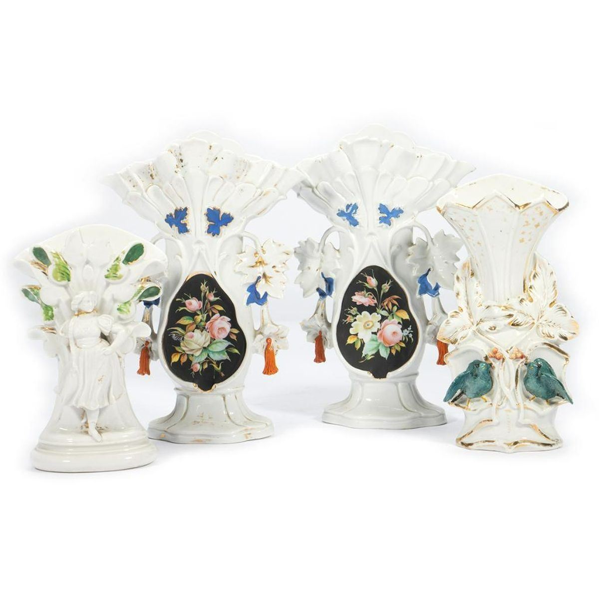 Comprised of a pair with black background floral centers, one with green birds, and one figural; unmarked/numbers only. Ranging in height from 7in. to 9 1/2in. Condition: The figural vase has broken/missing arm and leg; all have wear to gilt.