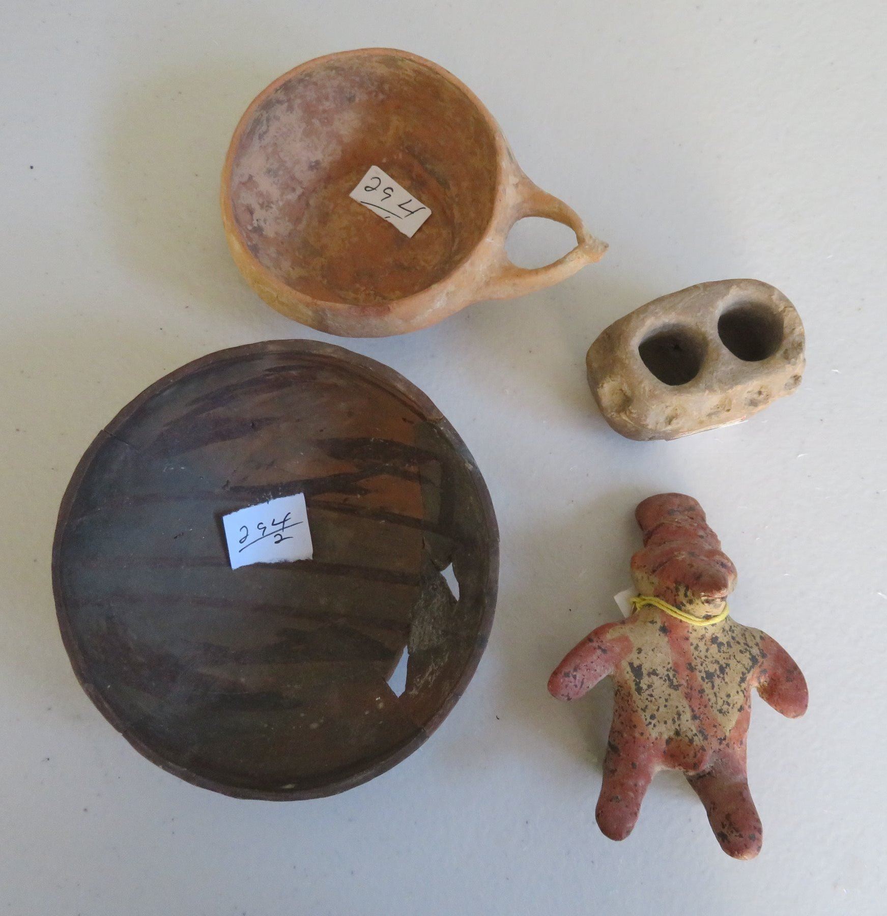 Collection of 4 Pre-Columbian Items, c. 1000 years old. Made of clay and paint, the largest bowl is 4 1/2". Colima, Mexico. Condition: As found, see images. Shipping: $26.50 w/insurance and signature, double-boxed.
