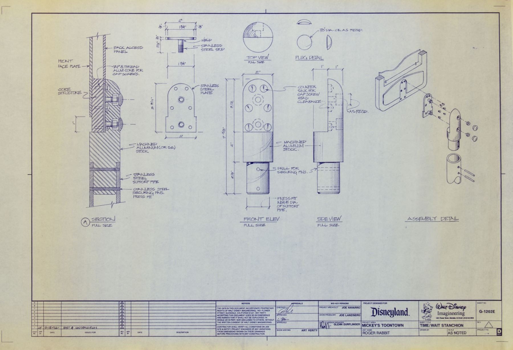 (Disneyland, 1992) A rare collection of (4) blueprints for the "Roger Rabbit's Car Toon Spin" attraction at Disneyland. This collection features elevations and details for the wait time sign to be used in the attraction. These blueprints measure approximately 24"x36" and are in very good condition overall with minor edge-wear and discoloration to some of the sheets. One of the blueprints is mounted to a foam core backing.