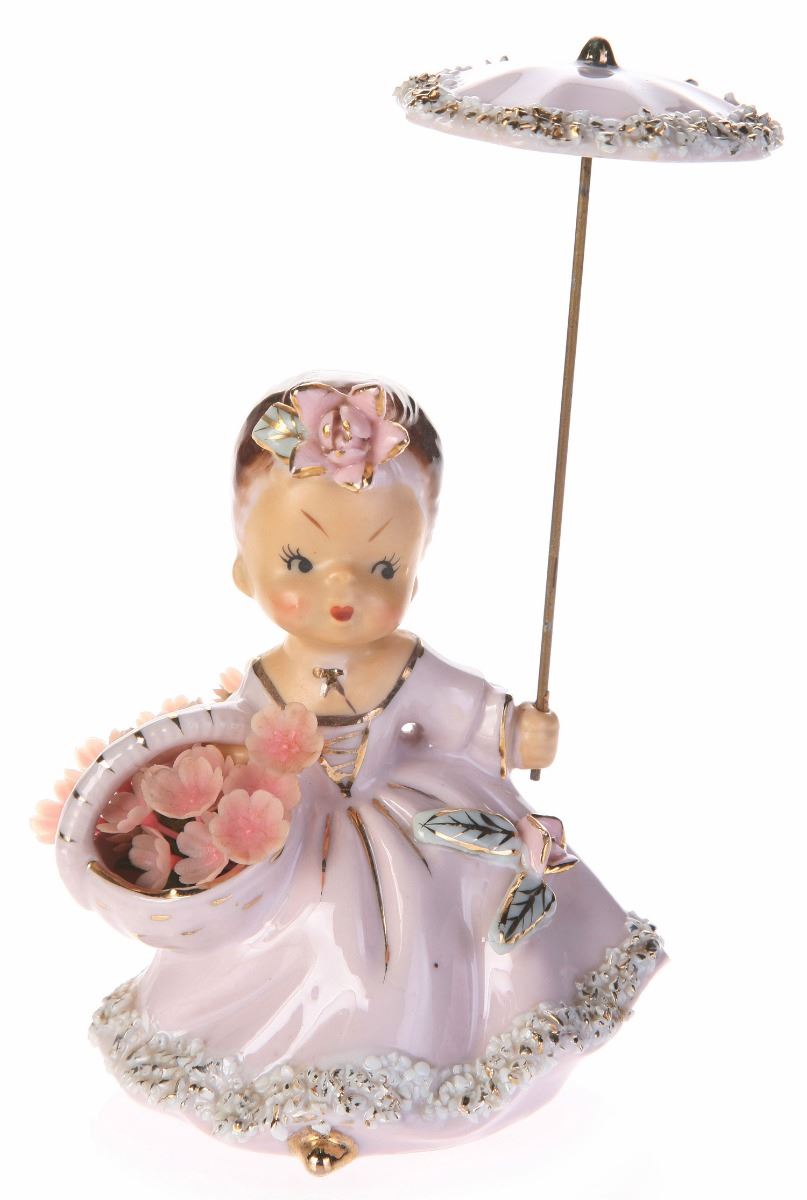 (Disneyland, 1950s-60s) Collection of (4) ceramic souvenirs from the Ruggles China and Gift shop on Main Street. Includes (2) ceramic rabbit figurines and (2) ceramic girl figurines with removable parasols. These items still retain their Ruggles Disneyland labels. This set is in good condition with minor wear.