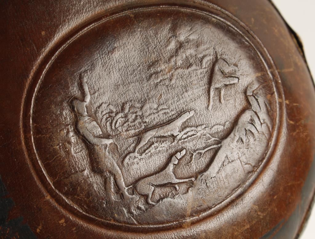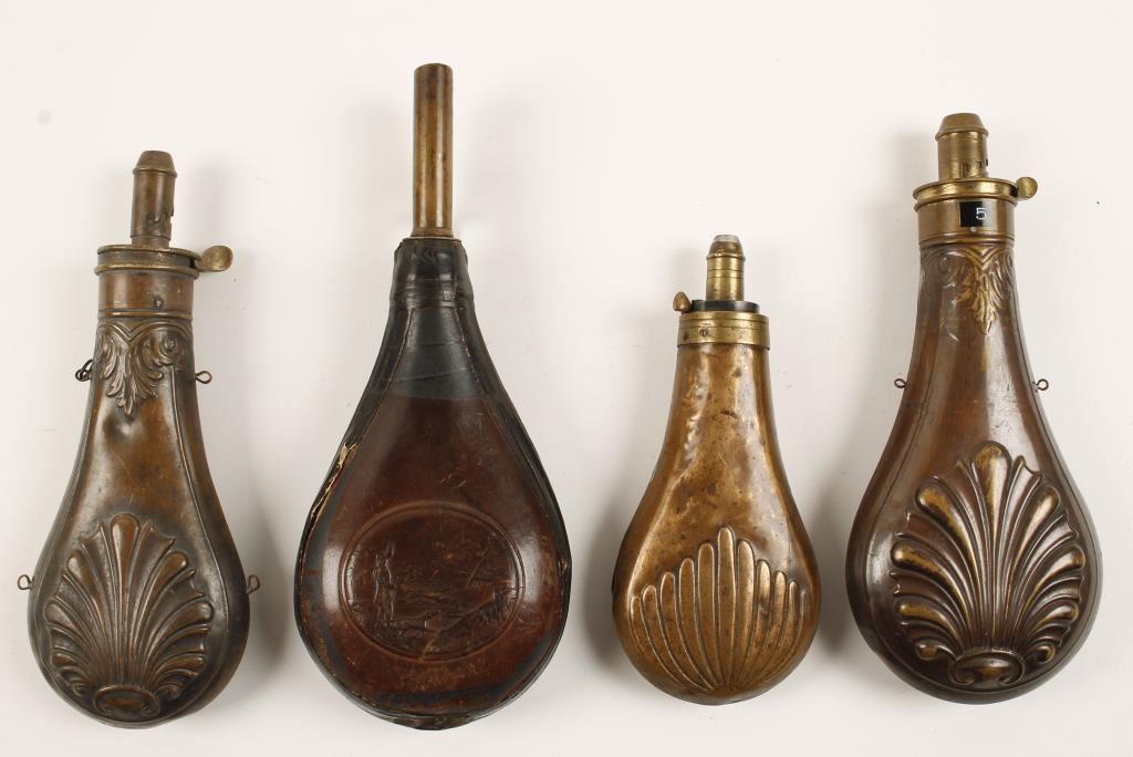 Including 3 of which are metal with similar shell type decoration and 1 leather with embossed hunting scene-this flask has been repaired at one time. 19th century.