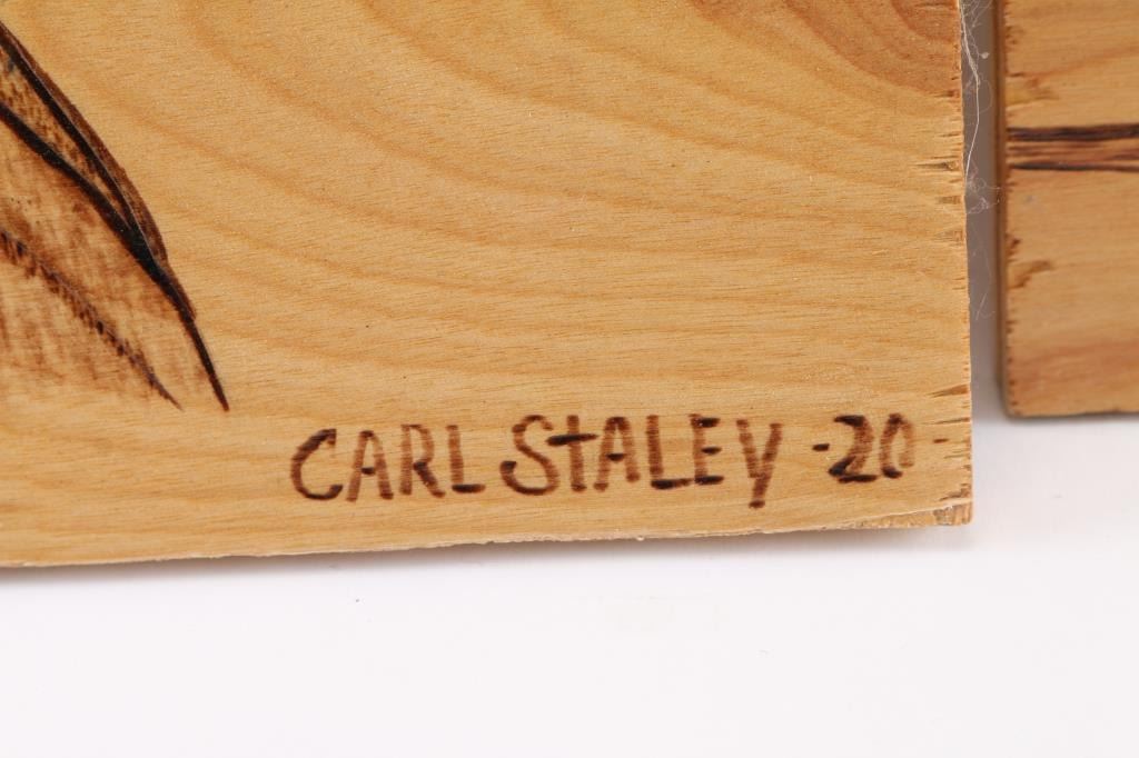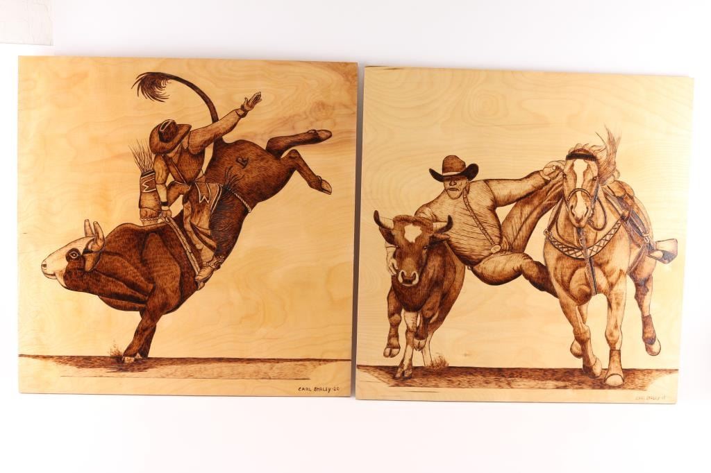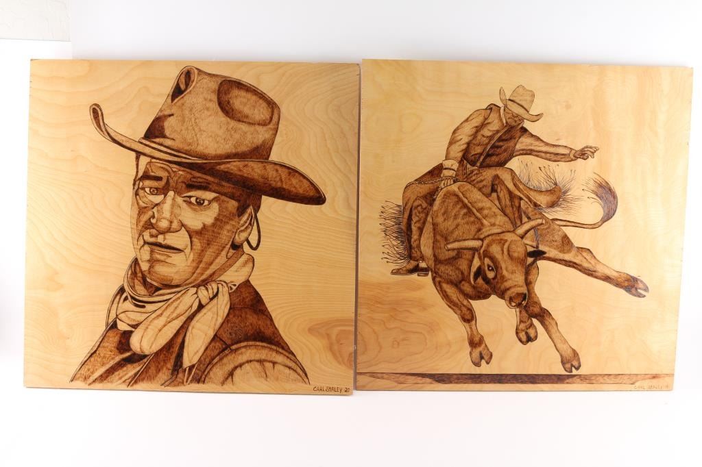 By Carl Staley. They are wood burned artwork. Each piece is 24 x 24". Subjects are John Wayne, three cowboys on steer.