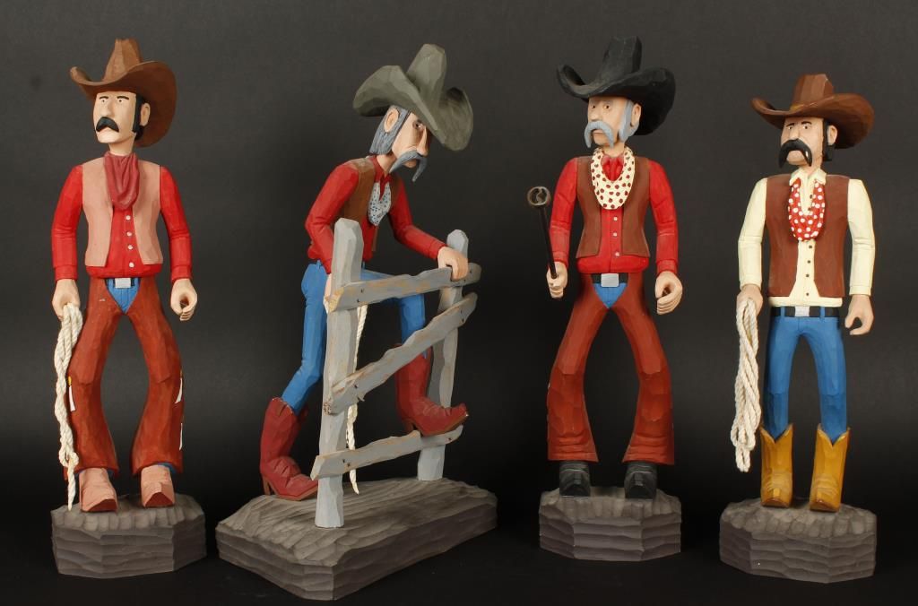 Entitled "The Branding Party". (1) Cowboy on fence, (1) cowboy with branding iron, and (2) cowboys with ropes. All in excellent condition and ranging from 12" to 13" tall.