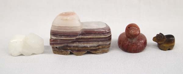 Collection of 4 Native American Zuni Hand Carved Fetishes, largest measures 2''L x 1.15''H, includes a bighorn ram, a bear, a duck, and a bear